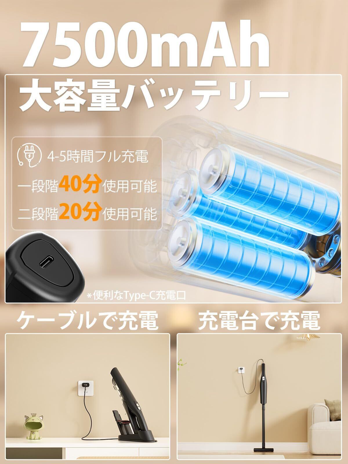 ✨【2種吸引モード切替最長40分稼働】コードレス掃除機は吸引力と駆動時間が最適化された「エコモード」と、よりパワフルな吸引力が必要なときに便利な「強力モード」を搭載しております。掃除中トリガーを押さえ続けることは不要、強力掃除機の吸引モードもワンタッチで簡単に切り替えます。7500mAhの大容量バッテリーが内蔵され、使用時間はエコモードで最長40分と、強力モードで最長20分間連続稼働が可能です。一人暮らしのお家から一戸建てまでどんなご家庭でも活躍します。