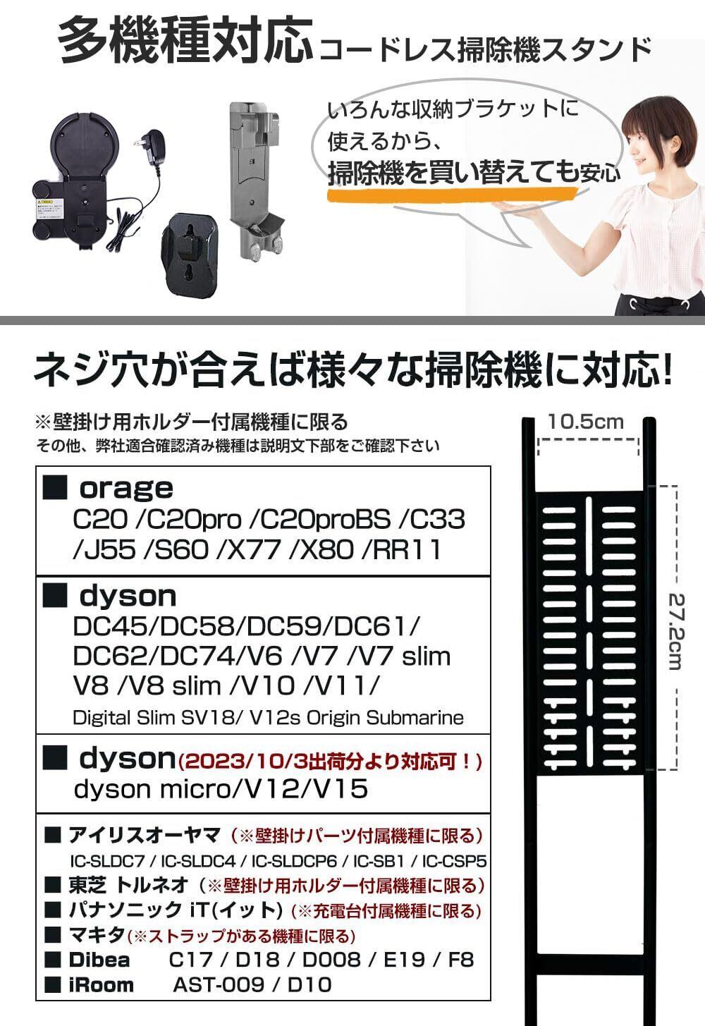 コードレス掃除機スタンド 対応機種(※壁掛け用ホルダー付属品に限る):orage C20 , C20pro , C20proBS , C33 , J55 ,S60,X77 ,X80, RR11 ,dyson , DC45 , DC58 , DC59 , DC61 , DC62 , DC74 , V6 , V7 ,V7 slim スリム , V8 ,V8 slim スリム , V10 , V11 , V12 , V15 , Digital Slim SV18 , アイリスオーヤマ(※壁掛けパーツ付属の機種のみ) IC-SLDC7 IC-SLDC4 , IC-SLDCP6 , IC-SB1 , IC-CSP5 , 東芝トルネオ(※付属品ホルダー利用不可※壁掛け用ホルダー付属機種に限る) , パナソニック , iT(イット)(※充電台付属機種に限る) ,マキタ(※ストラップがある機種に限る) ,Dibea , C17 , D18 , D008 , E19 , F8 , iRoom , AST-009 , D10 , Anker Eufy HomeVac S11 Go , E19 , K17
