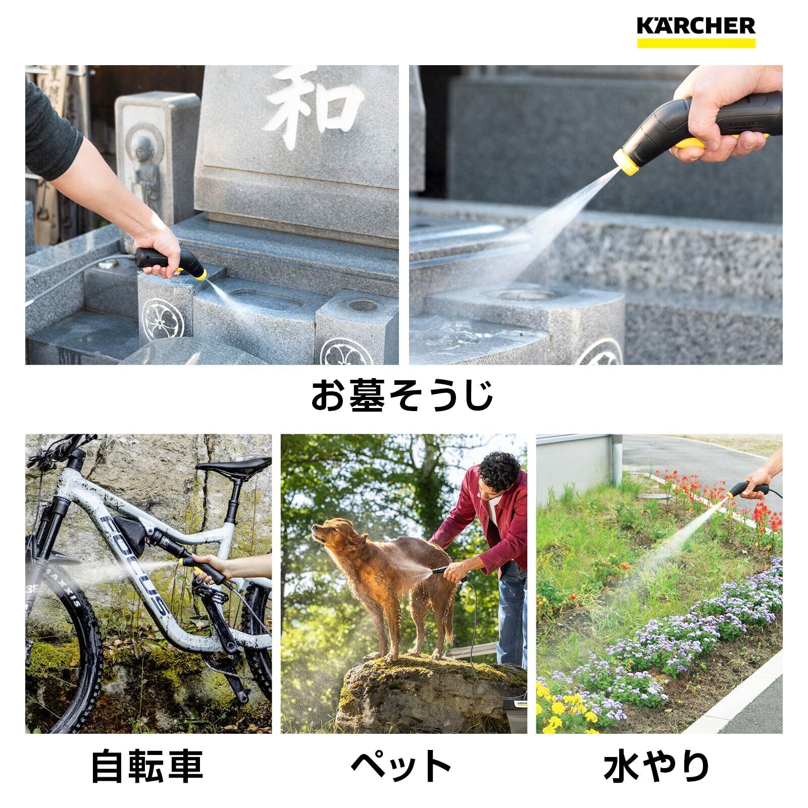 ■【多機能で様々なシーンに対応!】エアコンフィルターの洗浄、軽洗車はもちろん、墓石掃除や海での砂落としにも活躍します。豊富なオプションアクセサリーも用意されており、用途に応じてアタッチメントを変更することで、効率的に清掃できます。