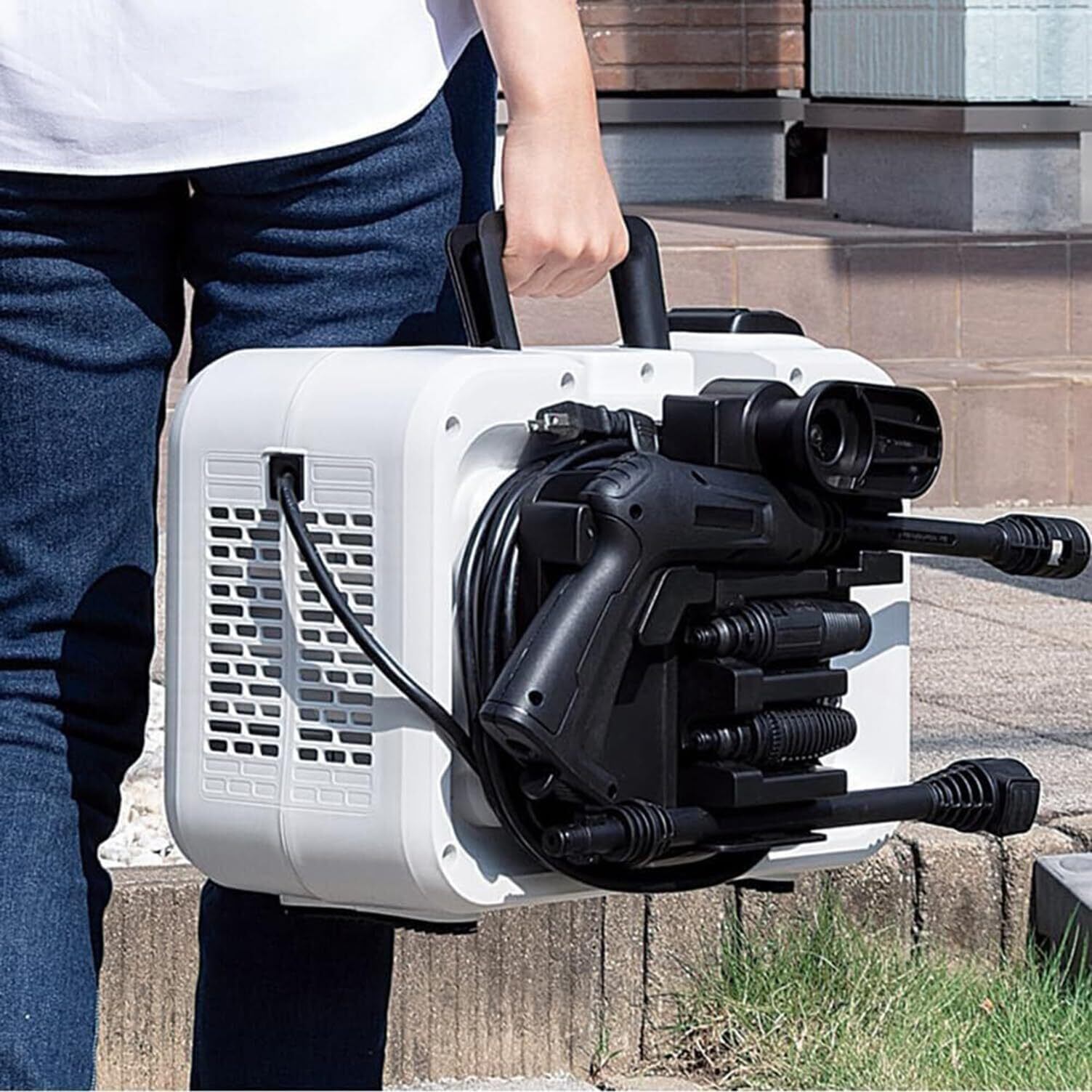 ■【コンパクトで持ち運び楽々!】本体サイズは幅283mm、奥行391mm、高さ297mmとコンパクト設計。狭い空間でも設置が容易で、持ち運びにも適しています。収納時も場所を取らず、いつでもどこでも高圧洗浄の便利さを存分にご堪能いただけます。