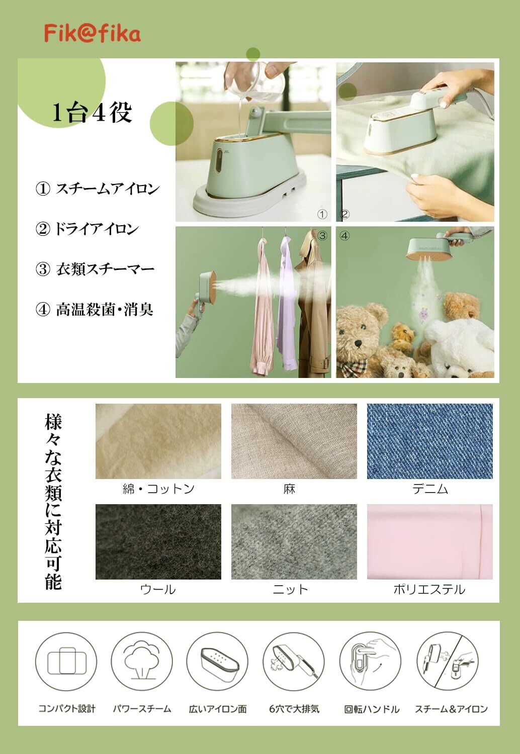 スチームアイロン 携帯アイロン シワ伸ばし 100~180℃高温 除菌 脱臭 連続スチーム ハンガーにかけたまま 衣類スチーマー 折り畳み式 回転ハンドル パワフル コンパクト ミニ 小型 ハンディ 軽量 時短 かわいい色 おしゃれ 家庭用 旅行用 出張用 PSE認証 Fik@fika