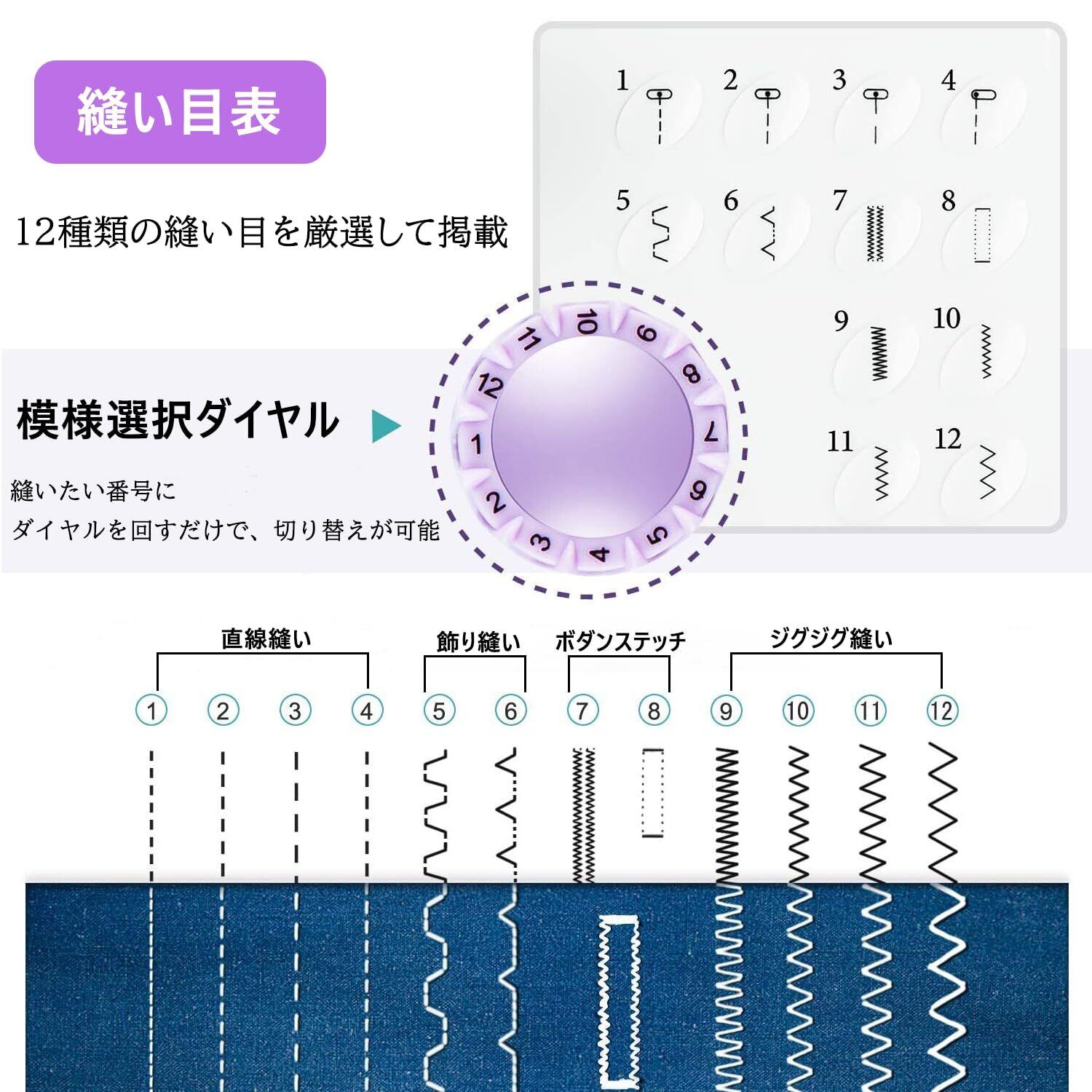 【12種類の縫い目】:地縫い、ジグジグ縫い、まつり縫い、ボタンホール、裾上げの用途に対応し、正/逆縫いモード、高速および低速モードをサポートし、自分に対して最適なモードを楽に選択できます。よく使う12種類の縫い目をダイヤルで回すだけで縫い模様の切替が可能。