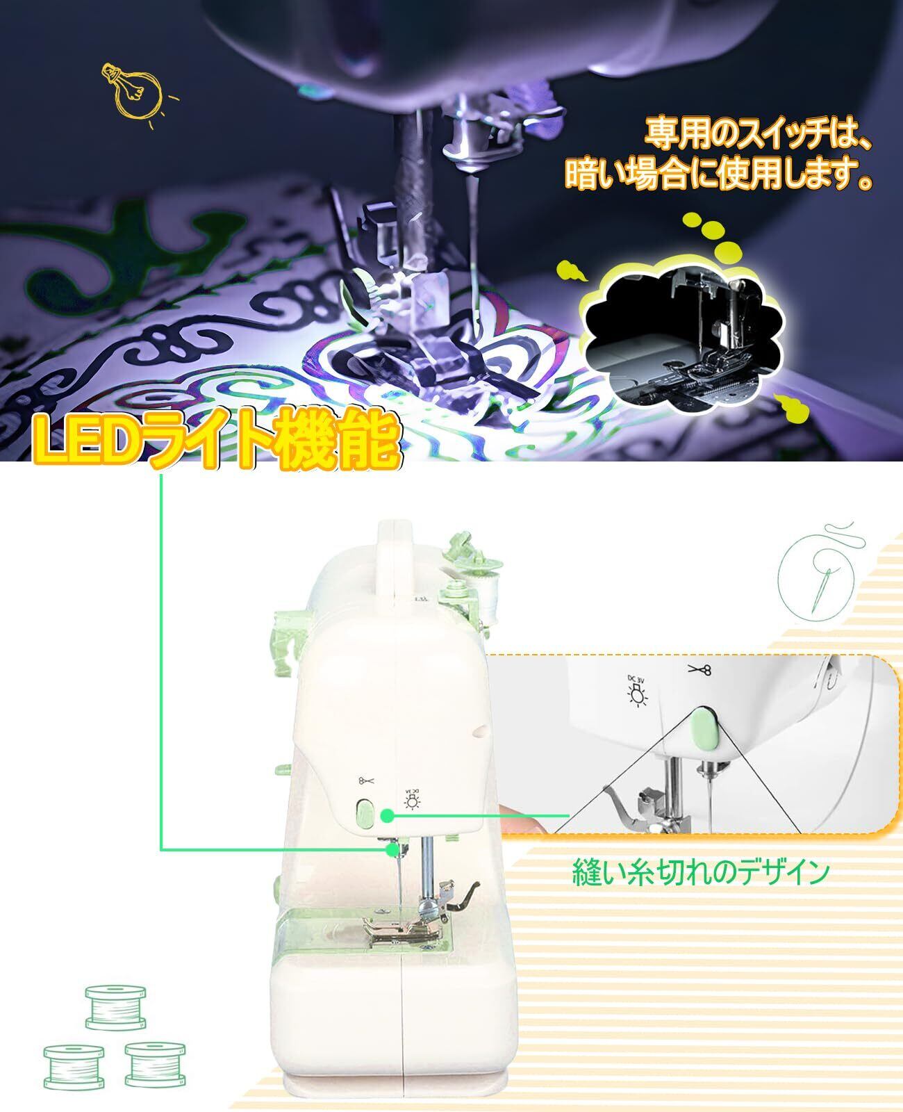 【led照明機能 糸切れ機能】:光不足を回避し、目の疲れを減らすために、ミシンにはledランプ機能が付属しており、光不足の環境や夜間でも衣類の縫製を行うことができる。ミシンが糸切れ機能デザインがあります、衣類を裁縫した後は、糸がミシン頭部の裁断片に糸を裁断することができてとても便利です。
