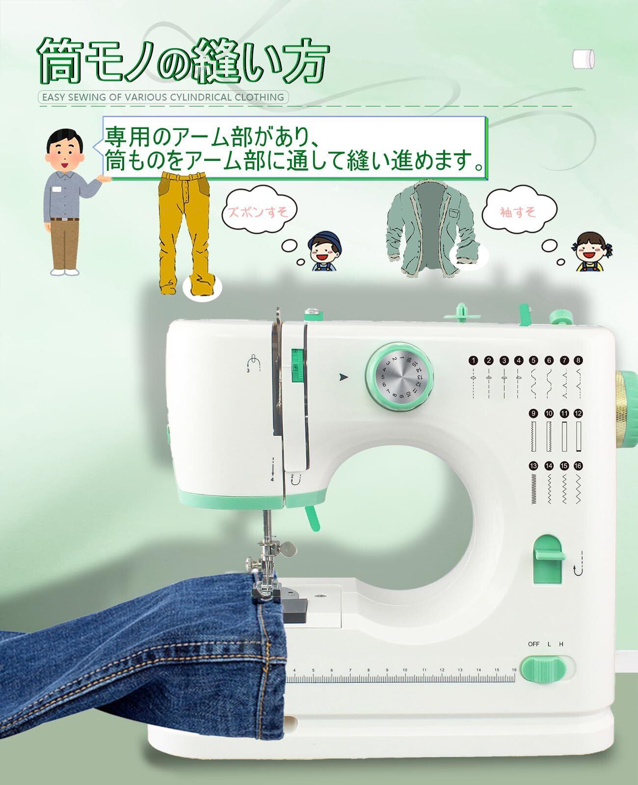 【筒モノの縫い方 下糸自動巻き機能 】:専用のアーム部があります、筒ものをアーム部に通して縫い進めます。袖やズボンのすそなどの筒ものを縫うことができます。このミシンは下糸巻き取りの機能があります。電源スイッチを操作して高速に下糸を巻き、手動巻き線による悩みがないです、時間と労力を節約することができます。