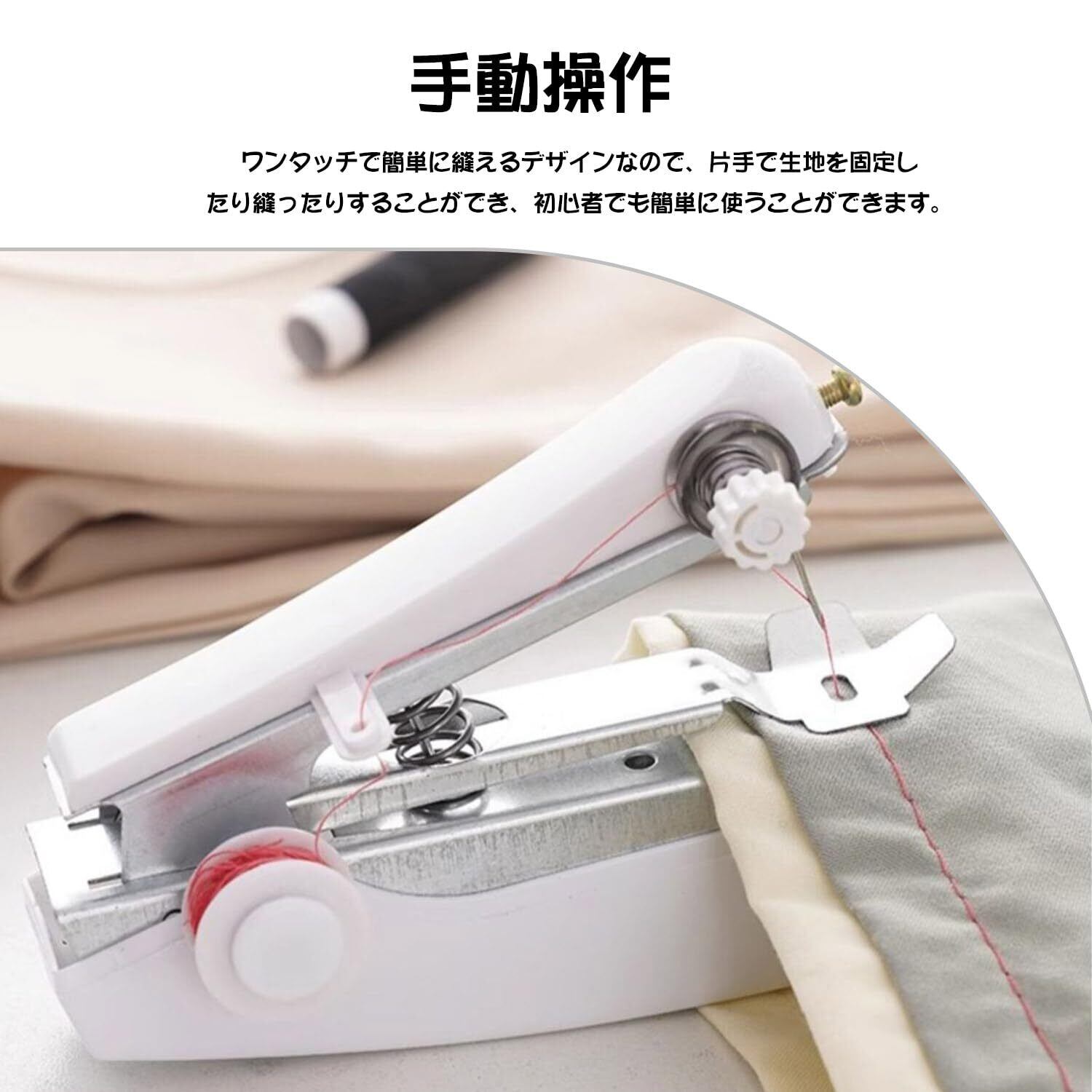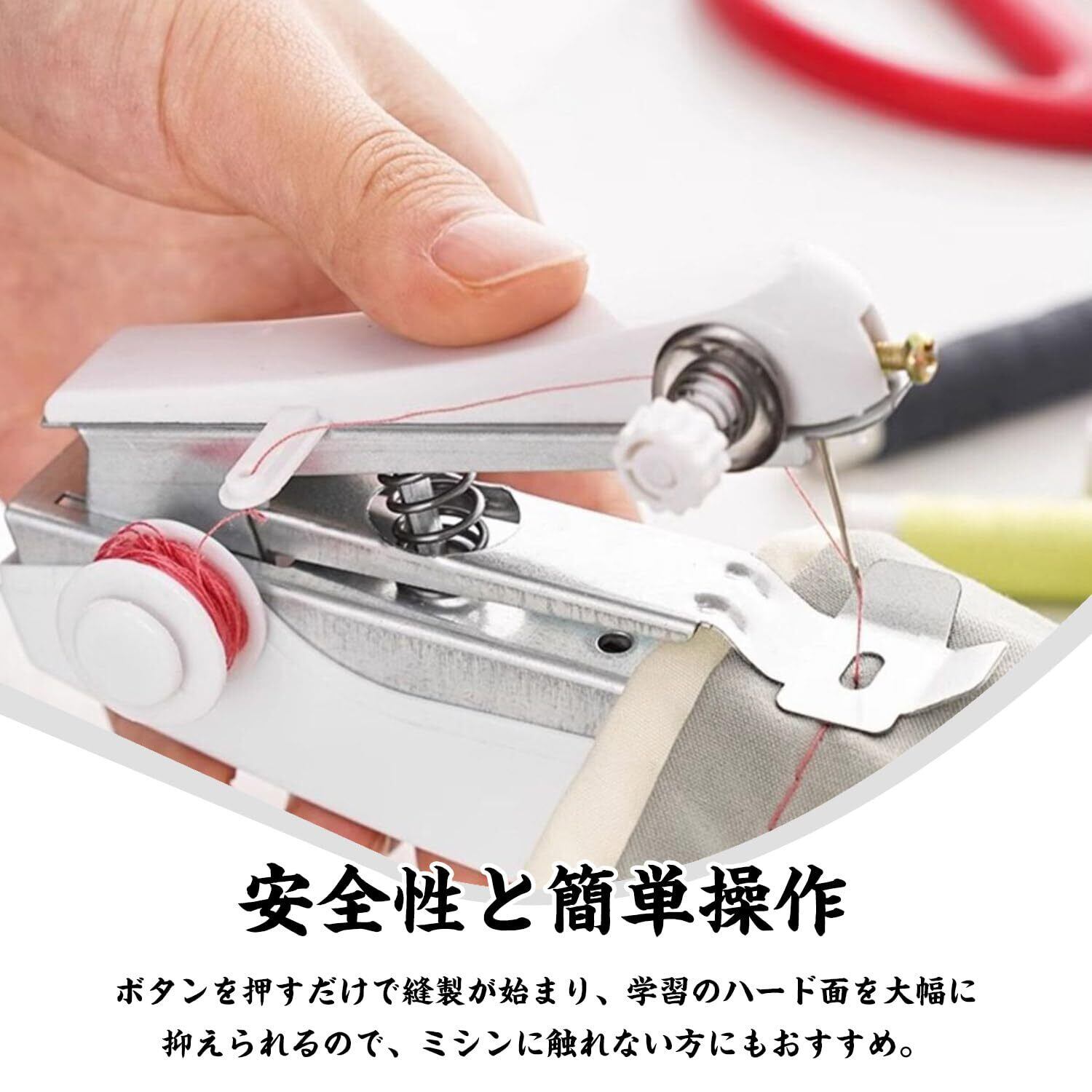 【直感的な使い方と操作性】操作は「糸を通す→縫いたい部分に合わせる→プッシュボタンを押す」だけ!初心者でも数秒で覚えられる直感的な動作。加長糸軸により、長時間の縫製でも糸切れの心配が少なく、野外での作業や出張先の急修に最適なポータブル ハンディミシンです。