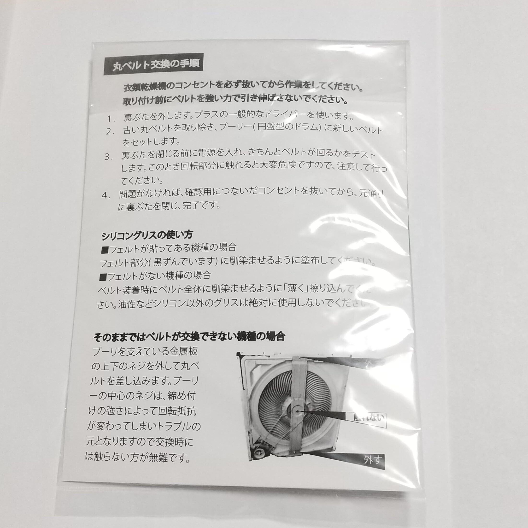 この商品はタイトルの衣類乾燥機の修理に合う丸ベルトです。 メーカーの規格と同じ6mm径の交換用丸ベルト(互換品)です。実は5mm径でも動きますが、6mmと5mmでは断面積で1.44倍の差があり、5mmを代用すると伝導力不足やたわみ、伸び、切断の可能性が高くなります。きっちりと修理をしたいとお考えの方には6mm径ベルトをおすすめします。 本品には交換時に使用するシリコングリスを同梱しています。塗布することで加水分解(ウレタンがボロボロになる現象)を防止し、潤滑を滑らかにします。 一体成型ではなく、熱溶着しておりますので、溶着部には若干の凹凸が残りますが、使用には問題ございません。 円形に溶着するときに、カーブに沿って無理なく溶着するR溶着製法で作られていますので、従来品より滑らかな伝導性と高い耐久性を実現しました。 簡単な取り替え手順は本品の裏で説明しています。