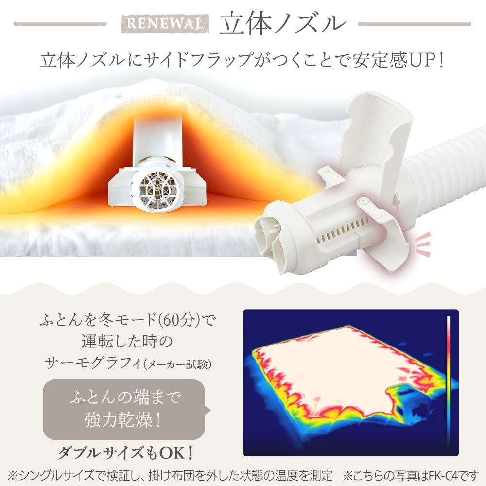■【使いやすさが魅力の布団乾燥機!】アイリスオーヤマのふとん乾燥機FK-C4-Cは、マット不要のシングルノズル設計で、面倒な準備なしにすぐに使用可能。手軽に布団や衣類を効率的に乾燥させることができます!