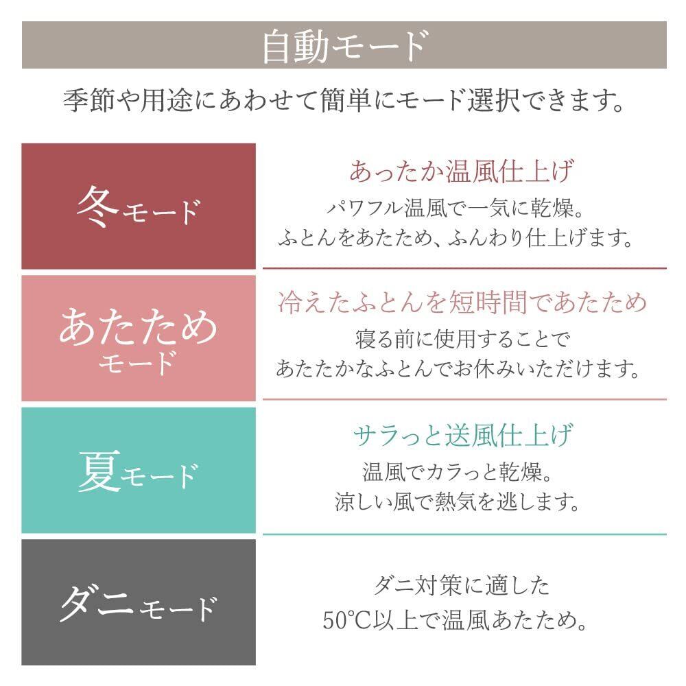 ・ダニモード:約50℃以上の高温風でダニ対策!外干しができない時期も、布団を清潔に保ちます。