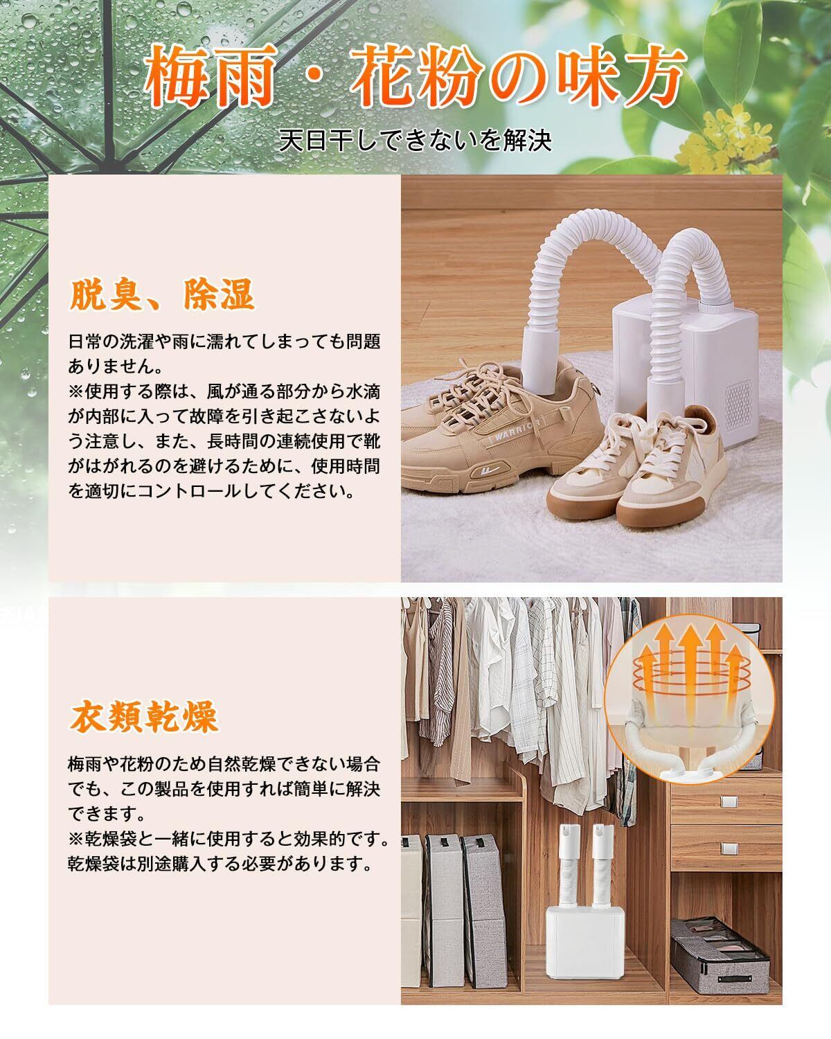 除湿&防潮対策:梅雨期や湿気の多い季節に特に有効。本布団乾燥機は強力な除湿機能で、靴や衣類内部の湿気を完全に排除し、快適な着用感をします。