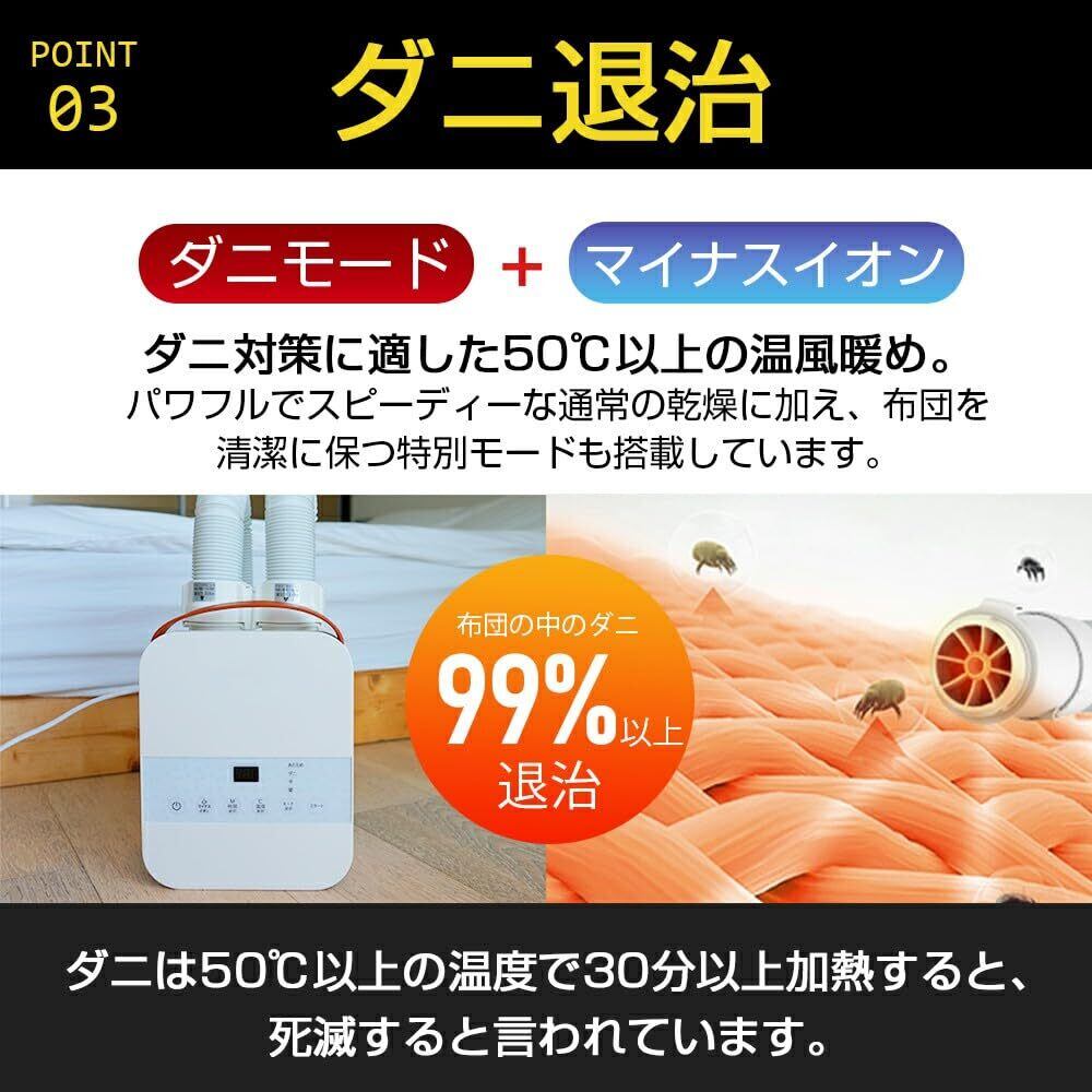 【自動乾燥モード4種類・一年中大活躍】布団乾燥機が4つのモードで、四季で利用できます:●あたためモード/高温風20分:寒い季節、おやすみ前にふとんをあたためたいときに高温風であたためます。●冬モード/高温風60分:寒い季節にふとんを乾燥したいときに、高温風で乾燥します。●夏モード(送風仕上げ)/高温風60分+送風(室温)20分:暑い季節にふとんを乾燥したいときに。高温風で乾燥後、送風で熱気を取り除きます。●ダニモード/高温風100分:ふとんのダニ対策をしたいときに。100分間の高温風運転を行います。●マイナスイオンを含む風機能も付いていますので、布団を清潔に保ちます。