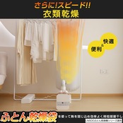 【セット買い・時短乾燥】ふとん乾燥機BW103にセットして時短乾燥できる衣類乾燥袋です。すぐに乾かしたい洗濯物も高温風+密閉空間で時短乾燥が可能です。急な洗濯物でも安心!梅雨などの雨天時や、低温環境下で洗濯物が乾きにくい冬場の部屋干しや、急に飛び込んできた、家族の急ぎの洗濯物などの部屋干しに、お持ちの布団乾燥機とセットで使える衣類乾燥カバーです。普段お使いのピンチハンガーと組み合わせてご使用頂けます。使用しない時にたたんでコンパクトに収納できます。