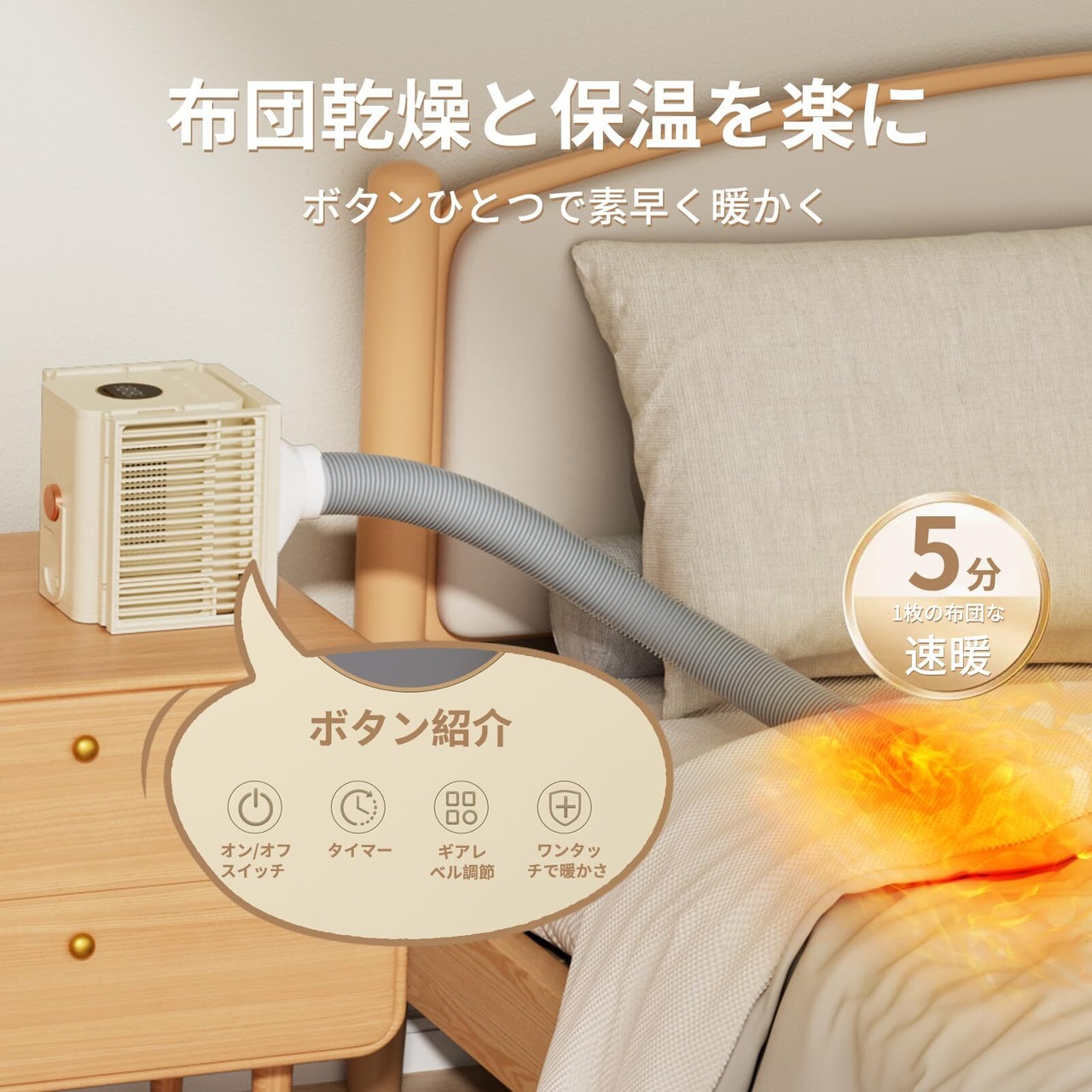 【多機能な乾燥機】:冬や雨の日には衣類を乾かすことはもちろん、梅雨時には布団も快適に乾燥できます。寝る前に使用すると、柔らかくてふんわりした蒲団を温め、心地よい睡眠を提供します。さらに、様々な種類の靴も乾燥可能で、ペットの毛並みも手軽に乾かせます