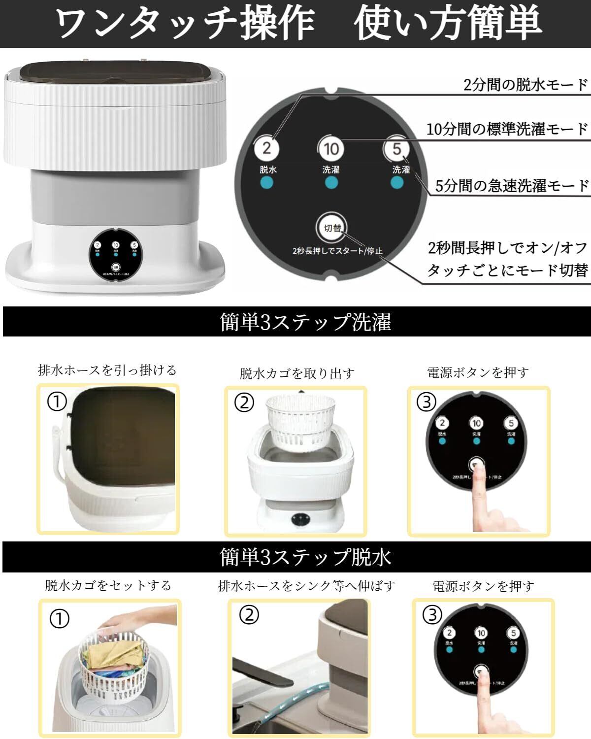 【洗濯・脱水一体化】この小型洗濯機は、二つの洗濯モードがあります。「5分間の急速洗濯モード」と「10分間の標準洗濯モード」を選ぶことができます。また2分間の急速脱水機能を搭載しており、最大85%の乾燥効果を実現することができます。排水ホースを本体に収納しておりますので、伸ばすだけで、簡単に排水できます。ご注意:脱水する場合は、付属の脱水カゴをセットして使用してください。洗濯の際は、脱水カゴを本体に入れないでください。