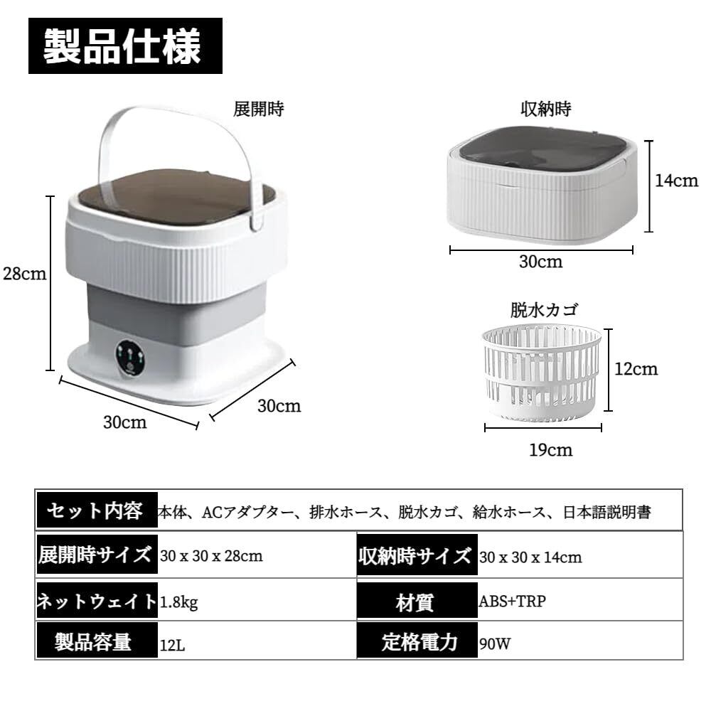 【製品仕様】電源コード式、電源:AC100-220V 50Hz、最大使用水量:約12L。収納時サイズ:30 x 30 x 14cm/展開時サイズ:30 x 30 x 28cm。重量:約1.8kg。付属品:排水ホース、脱水カゴ、給水ホース、日本語取扱説明書。
