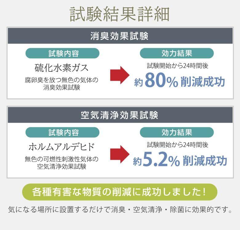 【消臭&除菌効果が実証済み】 国内機関での試験結果により、 ・消臭効果:約80%減少 ・空気清浄効果:約52%成功 と高い効果が実証されています。お子様やペットがいるご家庭にも安心です。