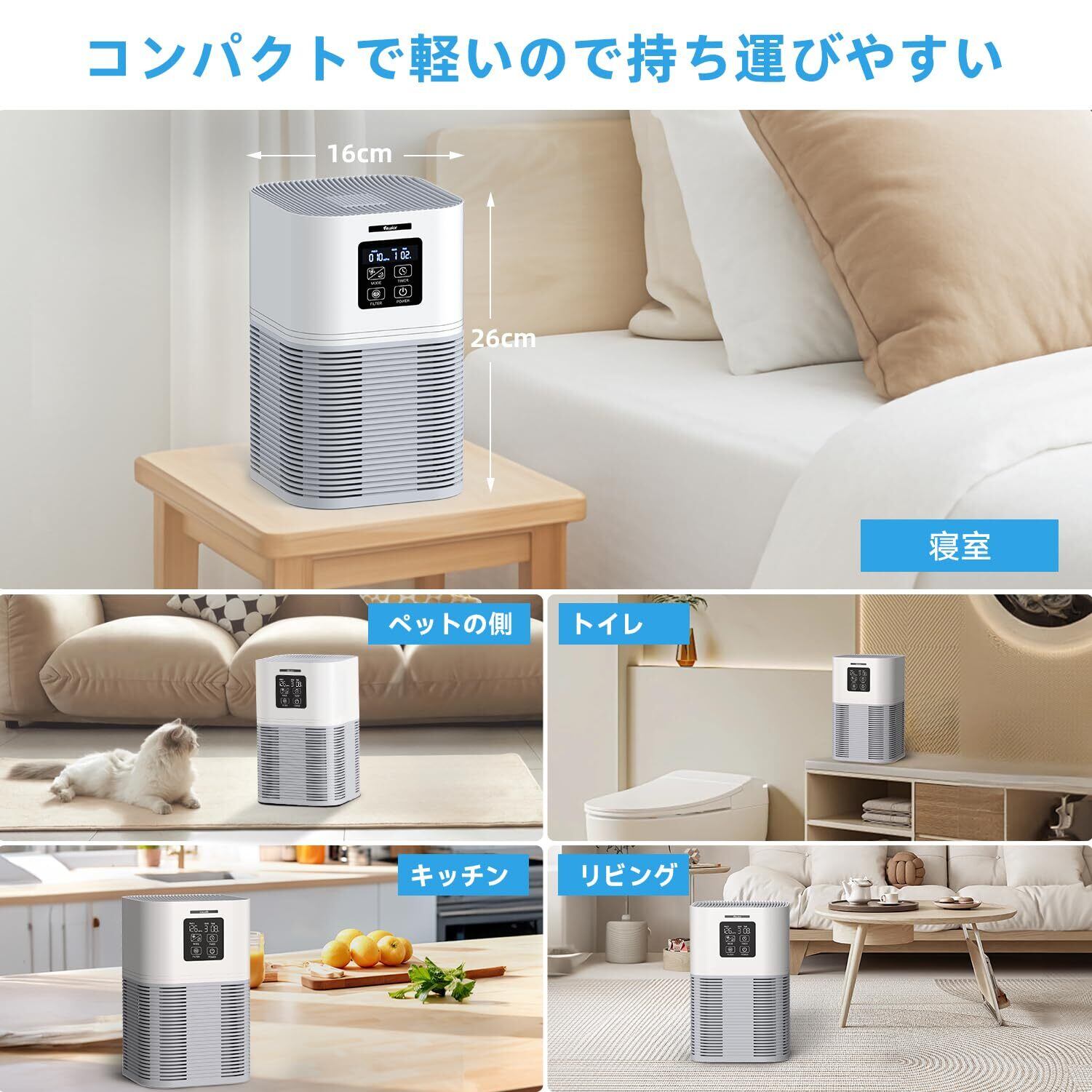 ■【コンパクトでポータブル】軽量設計で持ち運びが便利なこの空気清浄機は、卓上でも、寝室、玄関、リビング、トイレ、キッチン、オフィスなど、さまざまなシーンで活躍します。場所を選ばず、いつでもクリーンな空気を提供します。