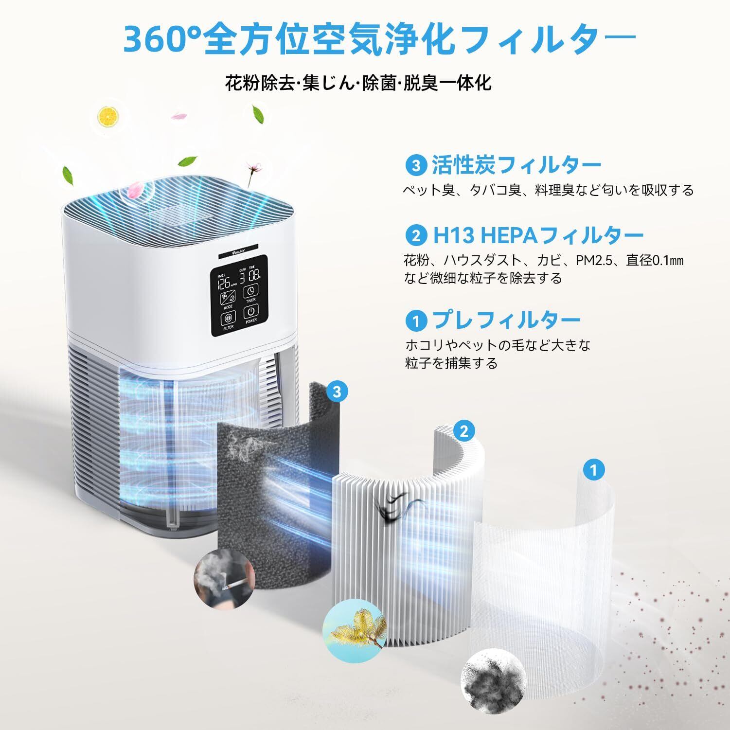 【360°全方位浄化・PM2.5自動空気質検知】2025新モデル空気清浄機は高品質のHEPAと脱臭活性炭を採用して、多層フィルターで、ホコリ、花粉、PM 2.5、ハウスダスト、細菌、カビ、ダニ、ウイルス、ペットの臭い、ペットの毛、0.1μmまでの微細粒子などを99.99%除去でき、除菌率はさらに99.99%になります! 360°全方位吸収の循環気流により、高い浄化スピードを実現し、集じん・除菌・脱臭・花粉対策の効果を著しくアップさせます。空気清浄機 小型は高精度PM2.5ホコリセンサーを搭載しているので、空気の汚れをリアルタイム検知します。PM2.5表示数值は部屋の空気の質によって変化します。【限定期間キャンペーン】今、空気清浄機をご注文いただくと、交換専用のフィルター(検索キーワード: B0CNQXFR5R)がもらえる!お気軽に説明書の連絡先よりまでご応募ください!