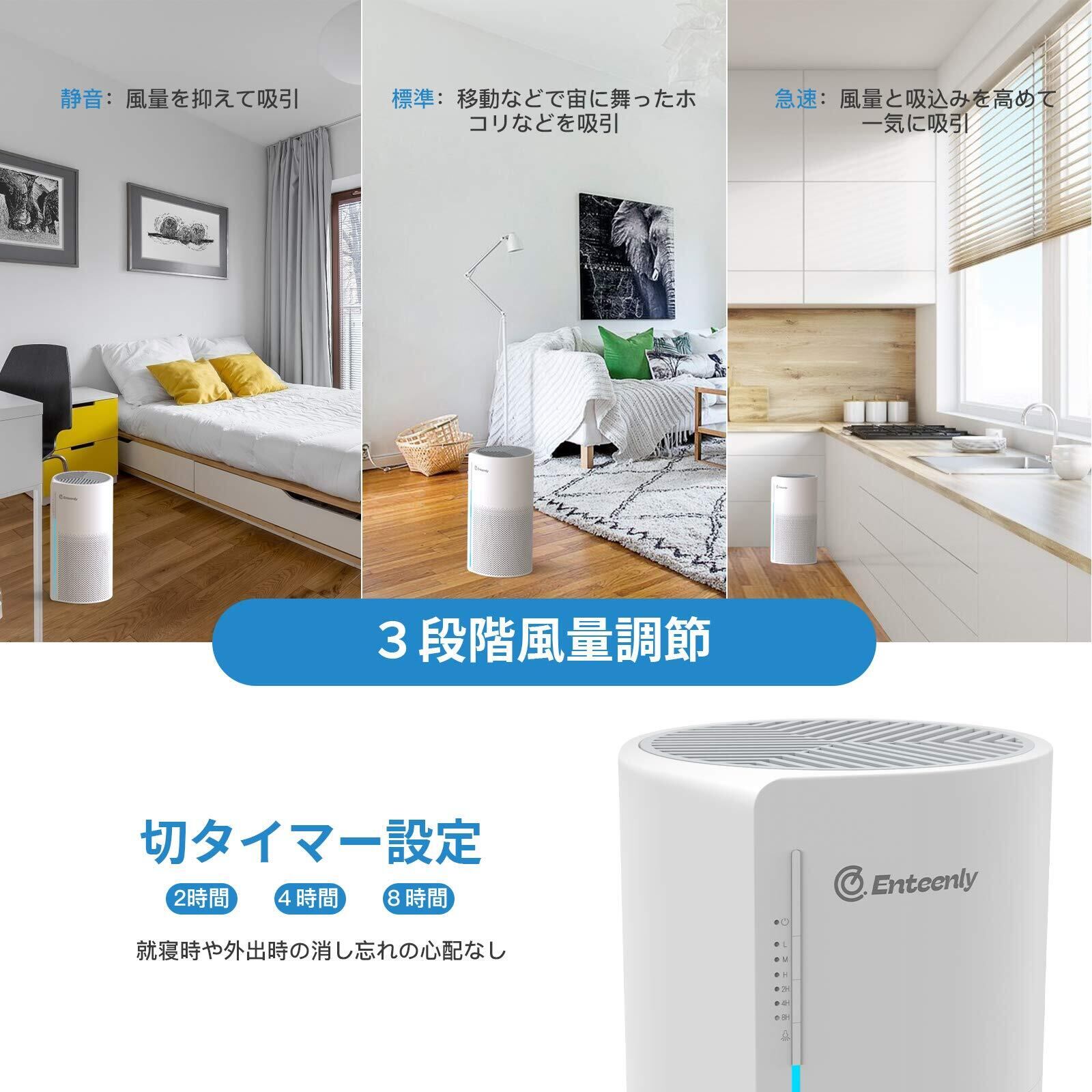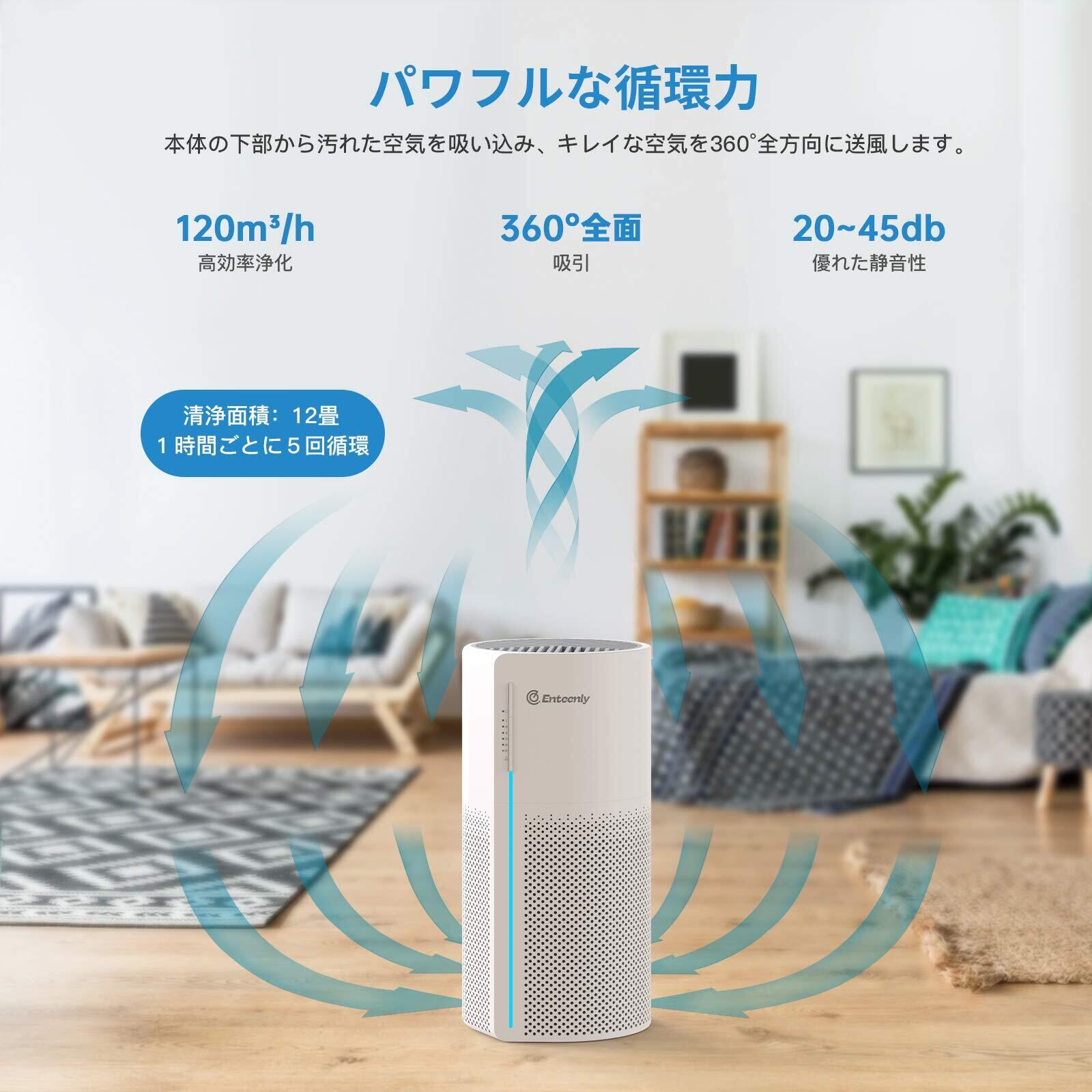 ■【1台3役で清潔な空間を実現】このEnteenly空気清浄機は、脱臭、除菌、空気清浄の3つの機能を兼ね備えています!静音設計でありながら、12畳まで対応しているため、リビングや寝室など、さまざまなシーンでご利用いただけます。