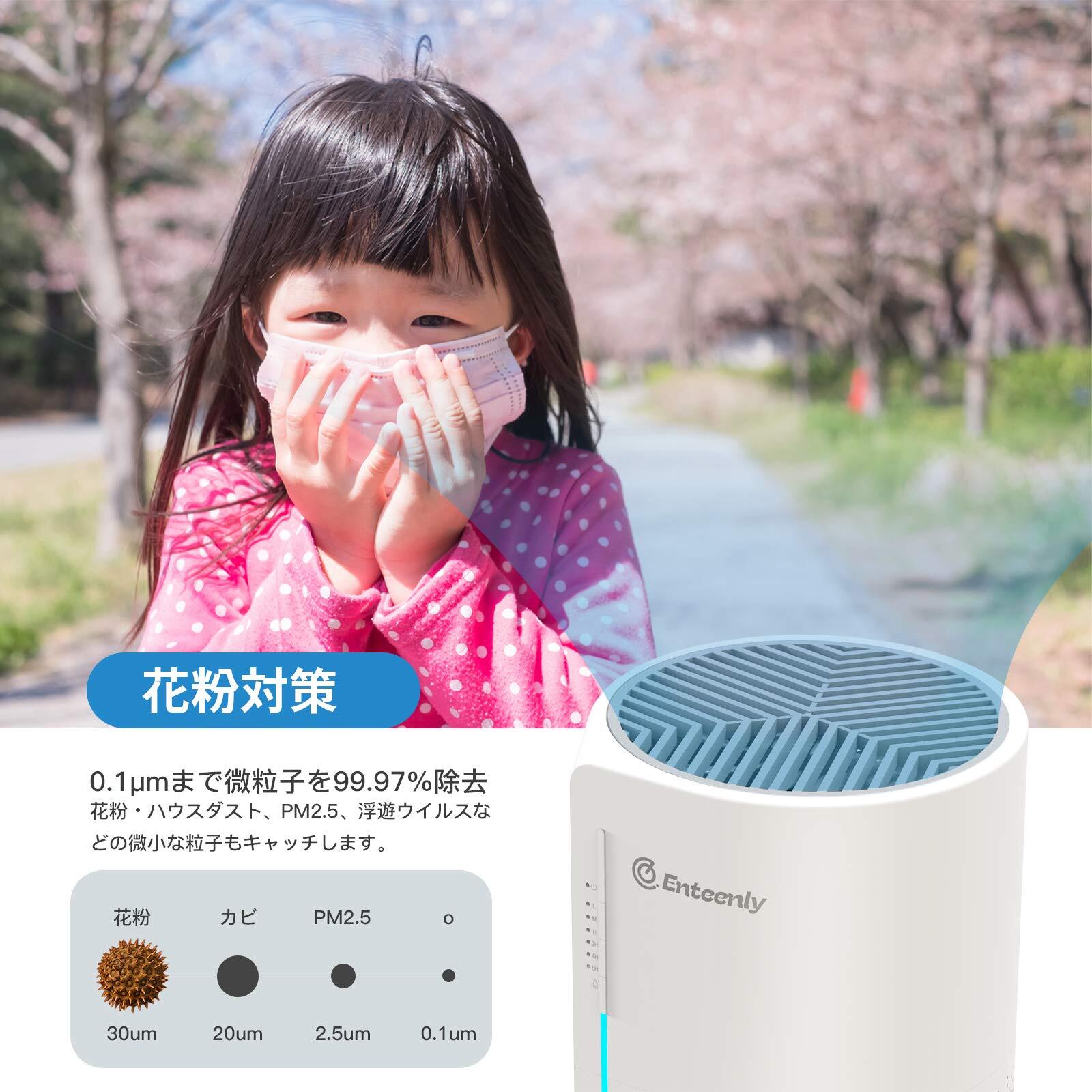 【圧倒的なHEPAフィルター、しっかりと除菌・集じん・消臭】 Enteenly空気清浄機能では、4段階システム浄化機能のある高性能フィルターを採用、春の花粉対策はもちろん、アレルギー症状・ウイルス対策にも役立ち、あらゆる空気の汚れをしっかり除去して部屋を清潔に保ってくれます。純正のHEPAフィルターを採用、花粉、カビの胞子、ほこり、ペットの鱗屑、微生物、煙など、空中のアレルゲンの99.97%*を捕捉します。高品質な粒状活性炭により、タバコ臭、ペットの臭い、料理の臭い、靴の臭いなど、家庭でよくある臭いをしっかり除去します。除菌フィルターにより有害な細菌・ウイルスを除去し、フィルター上で細菌やウイルスが増殖するのを防ぎます。本製品は加湿機能や紫外線殺菌ランプが付いていない。(加湿機能により異臭が発生したり、カビが生えたりする恐れがあります。紫外線殺菌ランプ皮膚や目の火傷を引き起こす可能性があり、大気汚染の原因である窒素酸化物を同時に生成している場合があります。)