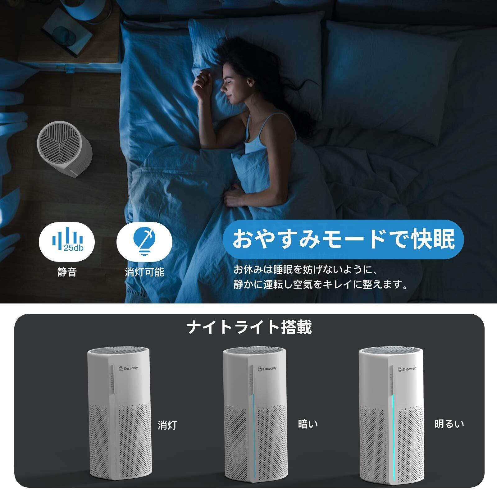 【静音モード搭載、優れた静音性】 空気力学技術を応用して、空気が通過する部分を細かく設計して、風がスムーズに通過しながらもノイズを最低限になるように、空気を静かに浄化してお部屋を快適に保ちます。静音モードの運転音は僅か25DBで、読書や勉強、仕事など集中したい空間でも、運転音を気にすることなく空気環境が整えられますので、充分に作業に取り組めます。作動音はほとんど聞こえないほど静かなので、お休みは睡眠を妨げないです。ナイトライト搭載され、キレイな空気や暖かい光(消灯可能)で「心地よい空間」を作り出し、心地よい眠りを誘い出します。