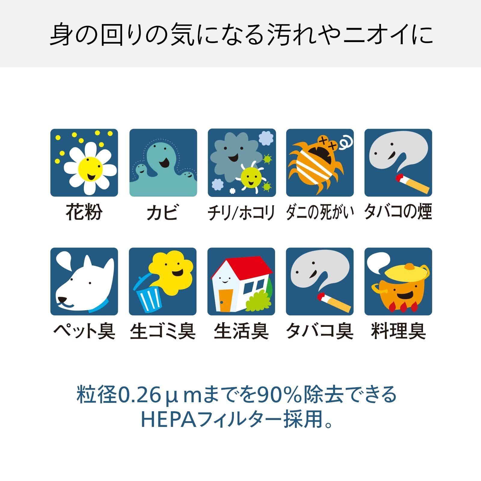 ◆集じん効果の高いHEPAフィルター。脱臭効果のある活性炭を搭載。ホコリや花粉、PM2.5よりも小さな粒子(粒径0.26μmまで)を90%除去できる高性能HEPAフィルターを搭載。身の回りの空気をきれいにします。