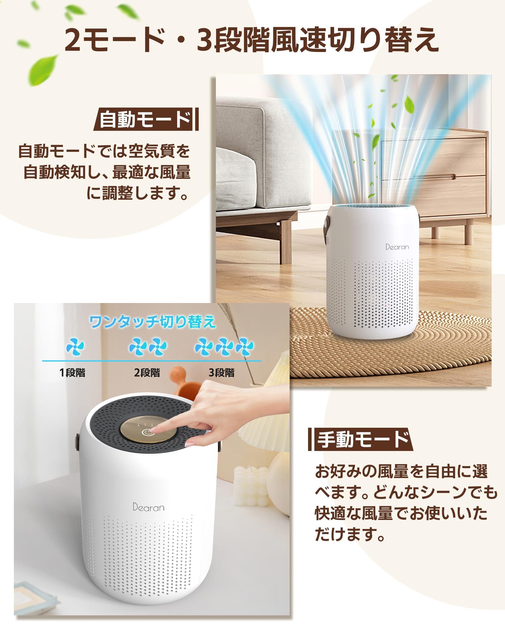 【3段階風速&2つモード】弊店の小型空気清浄機は、強風量・中風量・弱風量の3段階調節が可能。さらに、自動モードでは空気質を自動検知し、最適な風量に調整。手動モードではお好みの風量を自由に選べます。どんなシーンでも快適な風量でお使いいただけます。