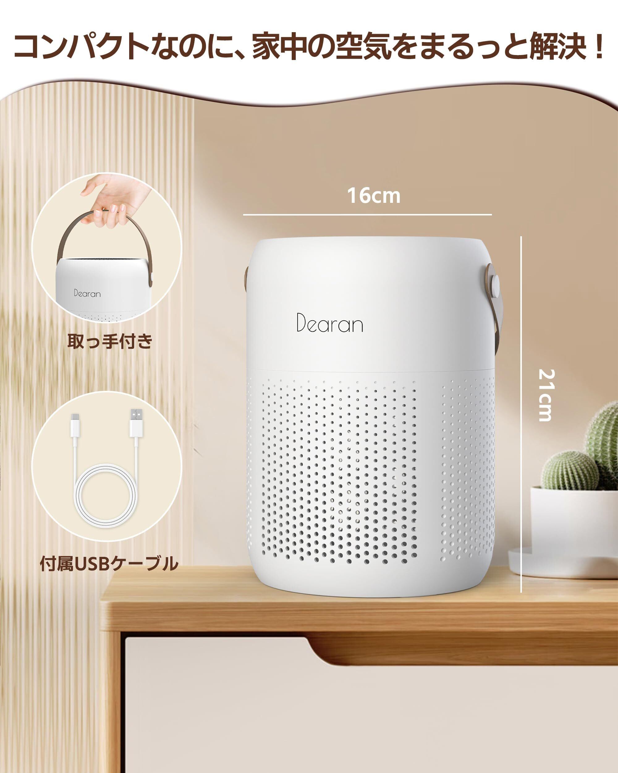 【静音設計&節電対策】サイズ:21*16 cm。ブラシレスモーターと独自開発した静音技術により、図書館並みの静かさを実現。日中はもちろん夜間の使用にも最適です。TYPE-C給電対応で、消費電力はわずか3W以下。24時間連続運転でも電気代を気にせず使用可能。低電力設計でありながら、高性能な空気浄化を実現し、環境にも優しい空気清浄機です。パッケージ内容:空気清浄機×1、USB充電ケーブル×1。(