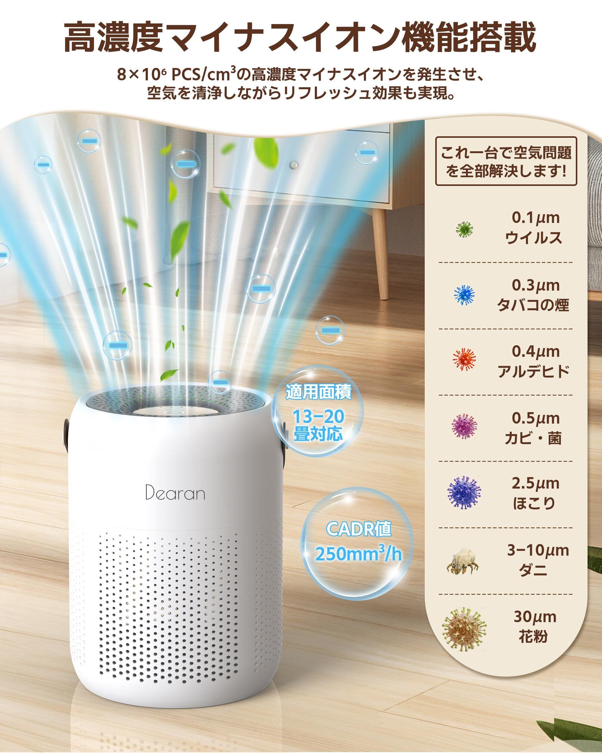 【マイナスイオン機能付き・強力な空気浄化】弊店の空気清浄機は、800万個の高濃度マイナスイオンを放出し、空気中の微細なホコリや花粉、ウイルスをしっかりキャッチ。360°全方位の吸気口を備えた花粉空気清浄機が、これらの粒子を機械内に吸い込み、H13高密度フィルターで徹底的に濾過します。1時間あたり最大150立方メートルの空気を浄化可能で、13〜20畳の広さにも対応。清潔でクリーンな空気を実現します。