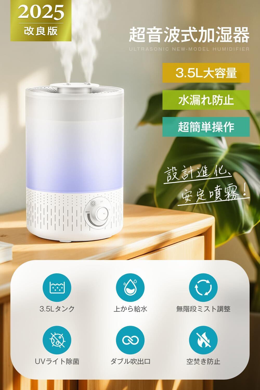 【2025年改良モデル・UVライト除菌】 加湿器 大容量 3.5L 超音波式 加湿器 卓上 おしゃれ アロマ対応 ダブル吹出口 上から注水 無階段ミスト調整 静音 54時間連続作動 吹出口360°調整 空焚き防止 水漏れ防止 寝室/オフィス/会社/家庭用 次亜塩素酸水対応 乾燥対策/花粉症対策 PSE認証済み