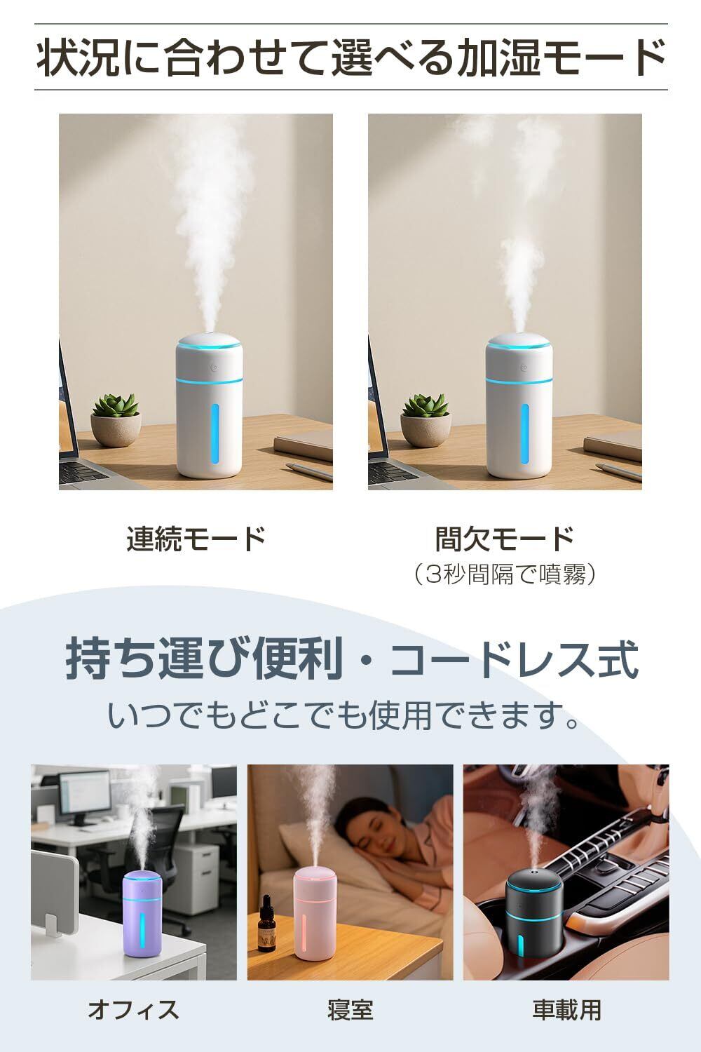 【最大12時間コードレス使用・自動オフ機能付き】1200mAhの大容量バッテリーが内蔵され、フル充電した後、コードレスで6~12時間使用できます(加湿のみの場合)。電源はUSBタイプなので、コンセントがない場所でもパソコンやモバイルバッテリーがあれば使えます。連続モードなら4時間で、断続モードなら8時間で自動に加湿を停止する機能付き、消し忘れなどの心配なく安心して使えます。