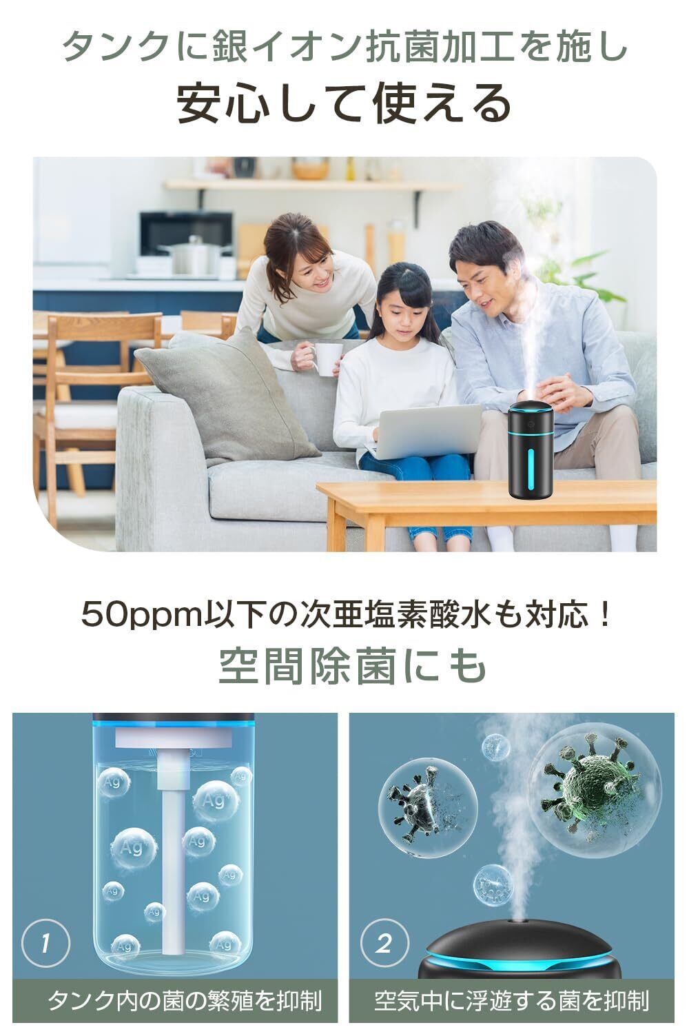 ■【革新的なデザインと機能】この加湿器は2025年の新設計を反映し、卓上でも使用しやすいコンパクトサイズでデザインされています。ホワイトのカラーはどんなインテリアにも調和し、現代的なスタイルを演出。銀イオン抗菌加工が施されており、清潔な環境を保てます。