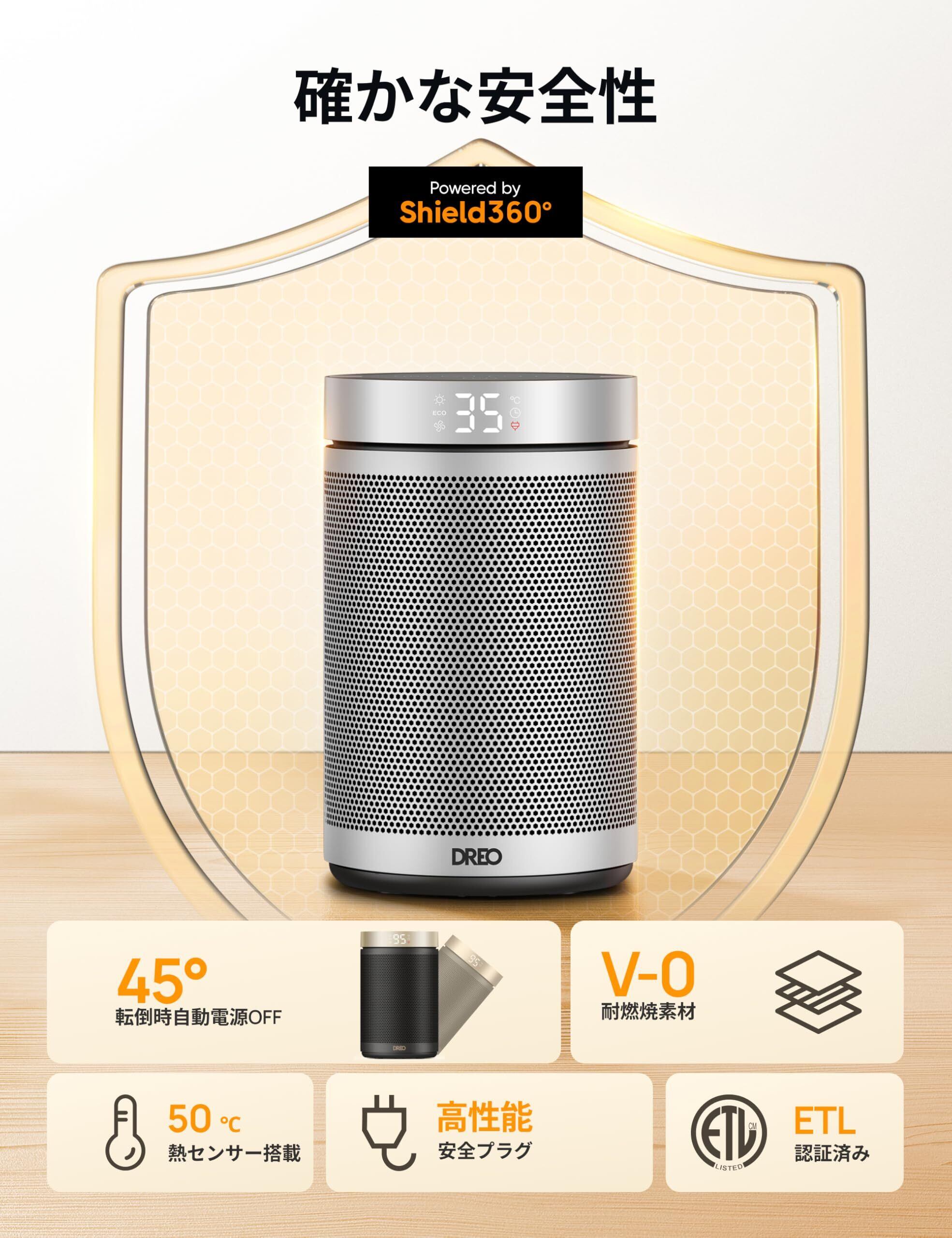【安心の暮らしを支える多重安全設計搭載】Dreo暖房器具、電気ヒーター 、安全に安心してご使用いただける製品です。①転倒OFF:転倒検知センサーにより、もしもの時の危険性をより素早くに察知するほか、V0難燃性素材、安全プラグといったETLなどの認証を備えています。地震などの不意な原因で転倒すると、電源が自動的に切る。②切り忘れ防止:運転開始から24時間無操作時自動的に停止する。③過熱保護:内部に温度センサーを搭載し、温度が上昇過ぎた時に、ヒーターが自動的停止する。1日中使っても安全安心!
