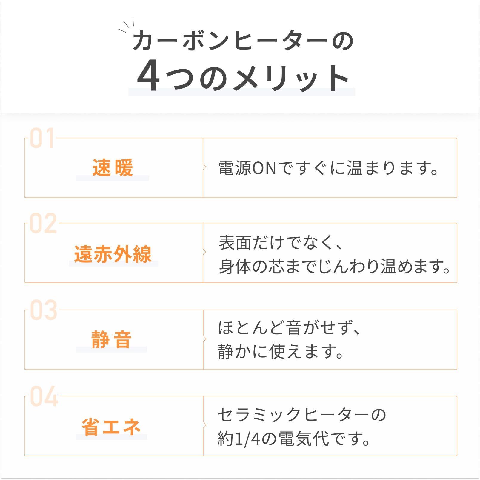 ■【省エネ設計でやさしい暖房】このヒーターは、効率的なカーボン加熱技術を採用しており、従来のヒーターと比べてエネルギー消費を抑えます。無駄な電力をカットし、快適な暖かさを保ちながら、電気代を賢く節約します。