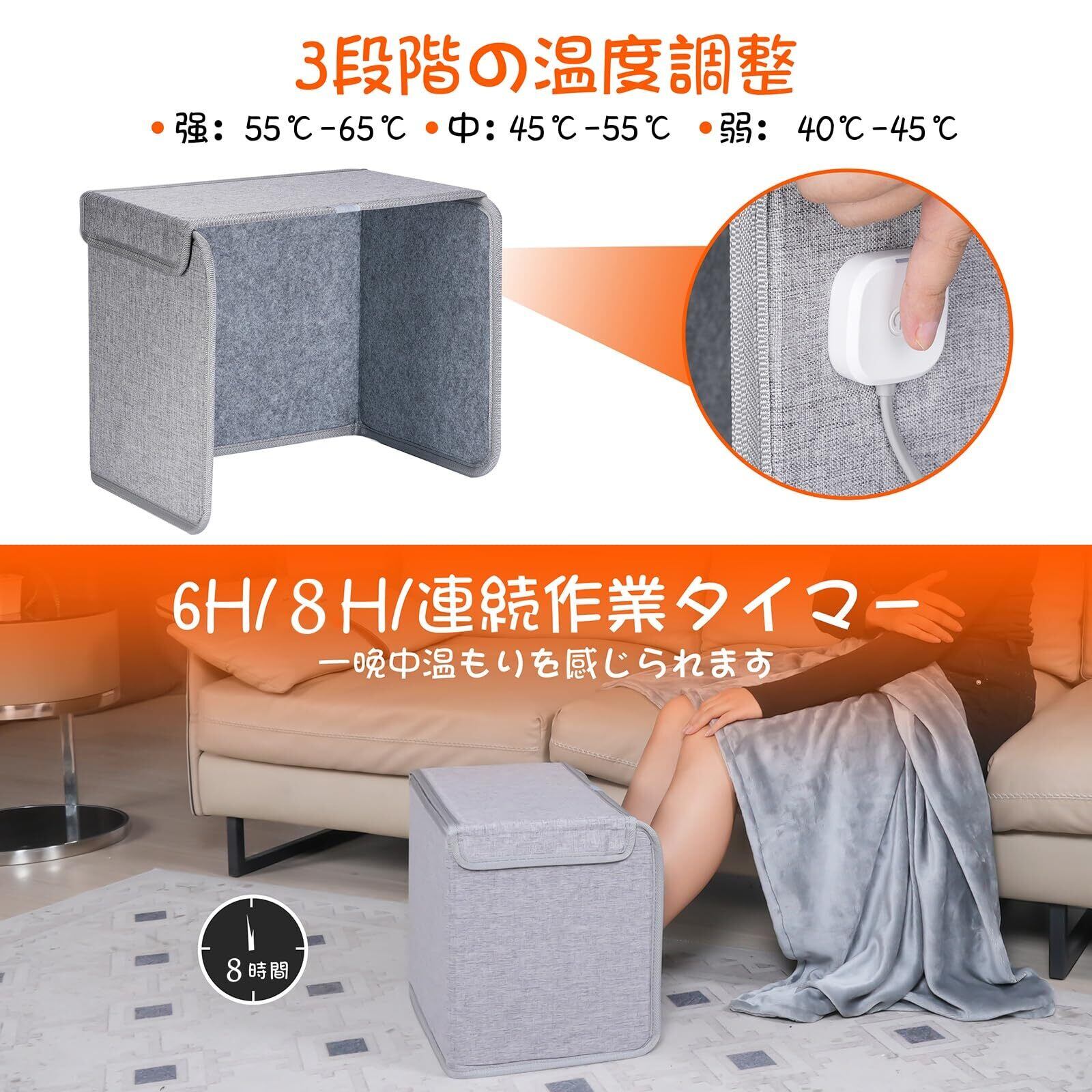 【3段階温度設定のパネルヒーター】昇温が早く、素早く温かさを感じることができるパネルヒーターです。専用カバー付き、保温効果が最高になります。カバーはマジックテープの設計で取り外しが可能です。温度は「弱:45℃」「中:55℃」「強:65℃」の3段階で調整可能で、お部屋の温度に合わせて、自分に合った暖かさに設定できます。特に冷え性でお悩みの方や、在宅ワークで長時間座っている方にも快適にお使いいただけます。内側の3面を均一に加熱し、足先からじんわりと温もりが広がり、厳しい寒さの中でも、心地よいひとときをお過ごしいただけます