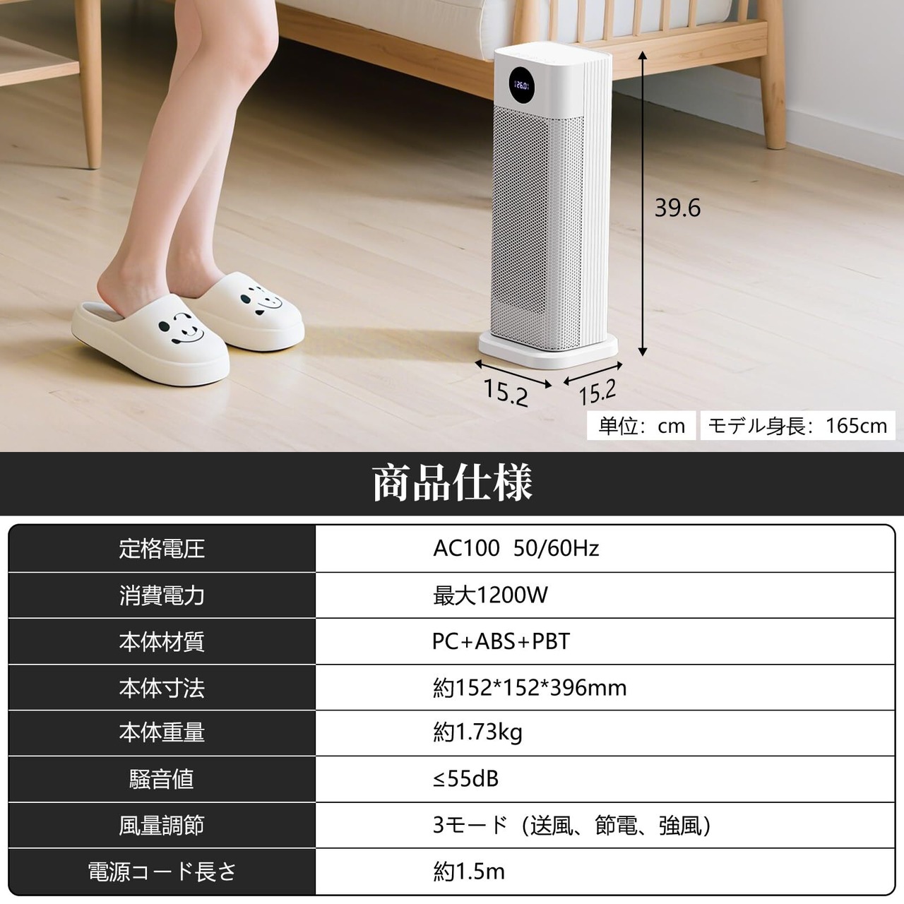 【商品仕様と安全なご使用について】コンパクトサイズながら最大1200Wの暖房力を発揮。静音設計(55dB以下)でリビングや寝室でも快適にご利用いただけます。1.5mの電源コードとPSE認証済みの安全設計で、家中どこでも安心してお使いください。ご使用前には必ず取扱説明書をご確認いただき、転倒時や高温部への接触にご注意ください。(※定格電圧:AC100V 50/60Hz 本体材質:PC+ABS+PBT)