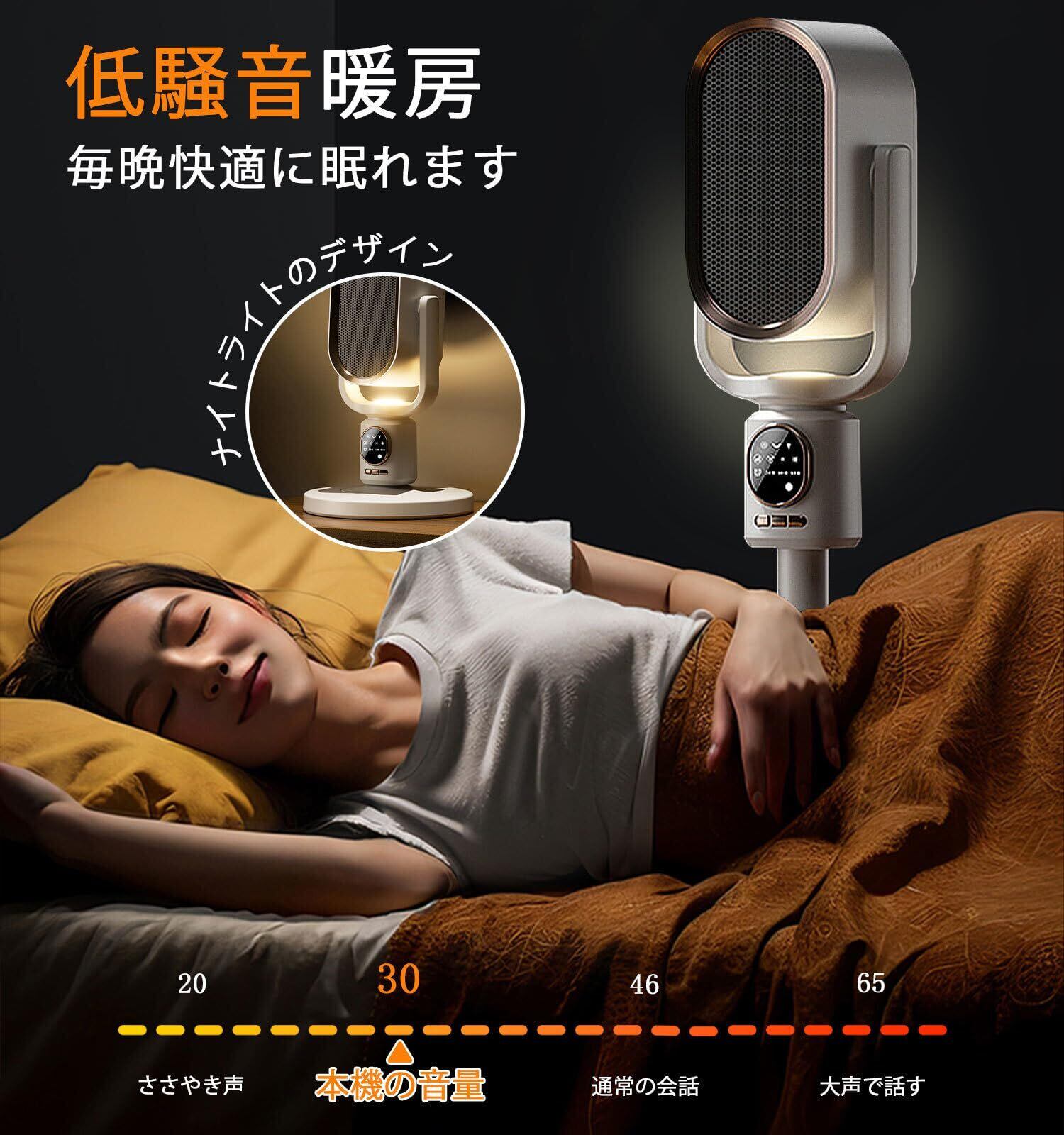 【2秒即速暖&DC省エネ性能 ファンヒーター】 最新PTCセラミックヒーター(1500W)搭載で、電源ONからわずか2秒で温風がお部屋全体に行き渡ります。冷風(5W)/暖風(1100W)/熱風(1500W)の3モード切替可能で、夏は涼風、冬はぽかぽか温風と季節を問わず活用できます。110°の自動左右首振り機能と110°の手動上下調節を組み合わせることで、足元から胸元までムラなく暖房。就寝時にも便利な優しい光のナイトライト内蔵で、真冬の夜も暖かく安全にお過ごしいただけます。省エネ設計で電気代を最大30%削減可能なスマートヒーティング制御を採用しています