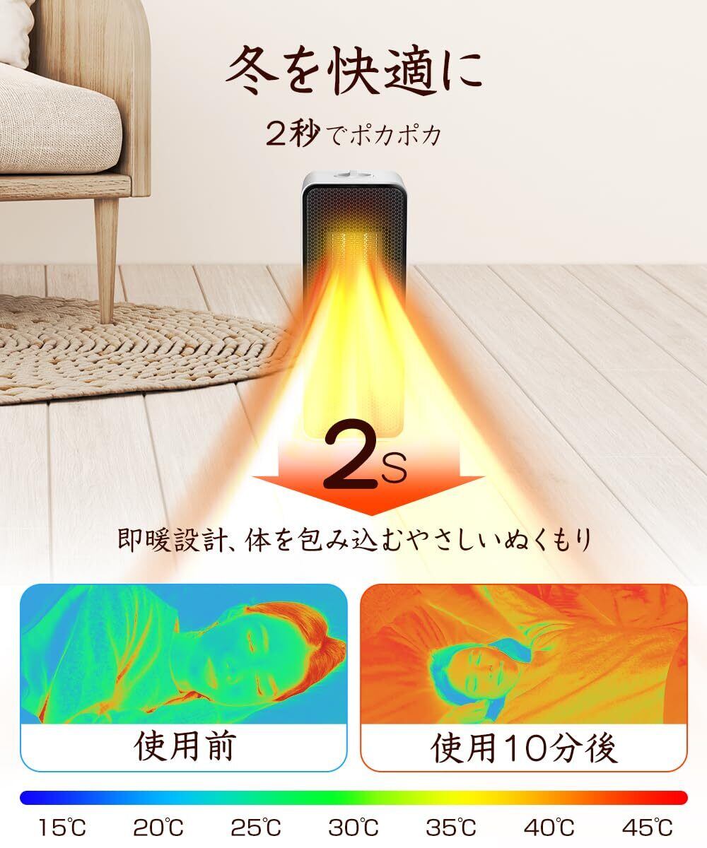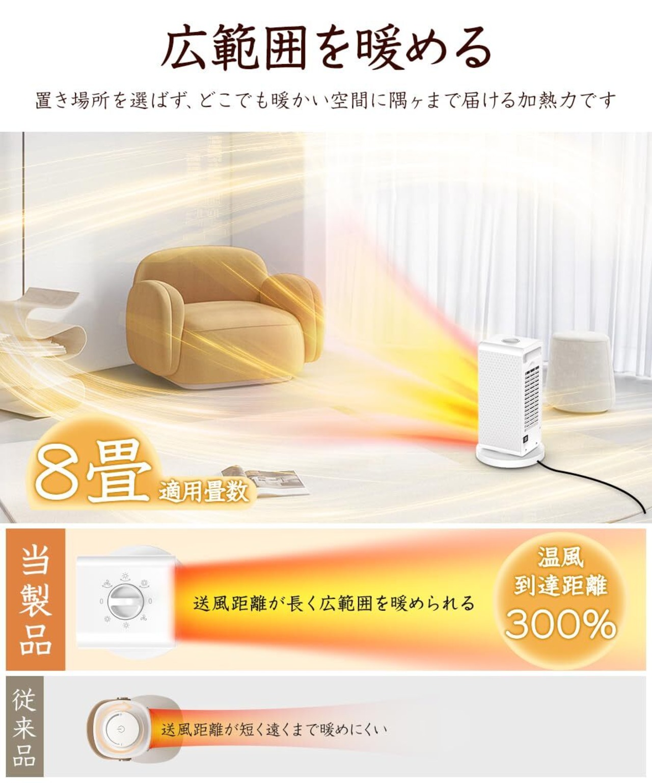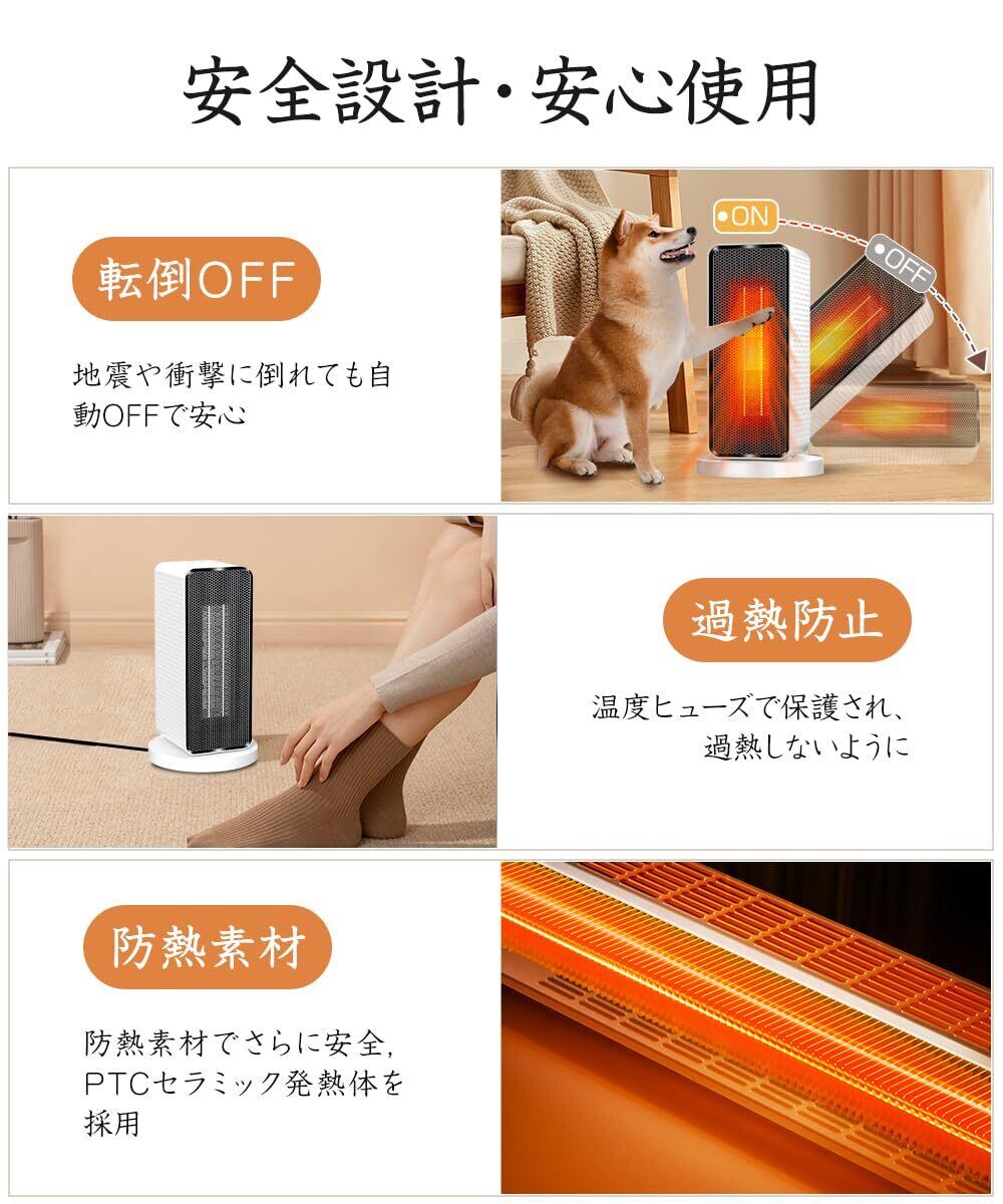 ■【安全性を重視した安心設計】このヒーターは転倒自動OFF機能と過熱保護機能を備えており、安全にご使用いただけます。お子様やペットがいるご家庭でも、安心してお使いいただける設計です。また、低騒音設計により、運転中も静かに過ごせます。