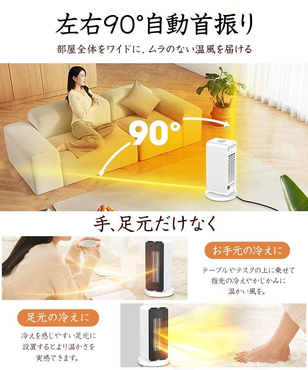 ■【自動首振り機能で広範囲をカバー】左右自動首振り機能を搭載しており、足元から頭まで均一に暖かさを届けます。デスク下や寝室、脱衣所など、様々な場面で利便性を発揮します。コンパクトなデザインながらも、広い範囲を温める力を持っています。