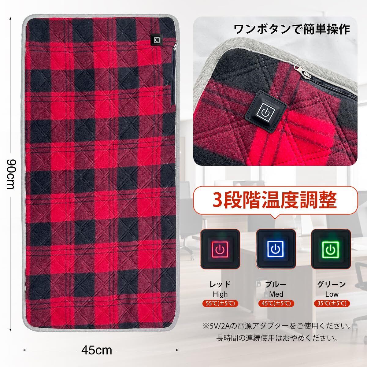 ■【3段階の温度調整で自分にぴったり】本製品には便利な3段階温度調整機能が備わっており、好みに応じた暖かさに簡単に設定することができます。在宅勤務中やリラックスタイムに、必要なときにさっと温まることができるのが嬉しいポイントです。