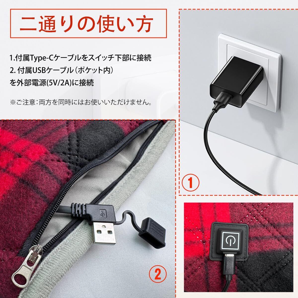簡単操作:電気座布団は電源のON/OFFだけのシンプル設計。35℃、45℃、55℃の3段階温度調節が可能なため、どなたでも簡単にご利用いただけます。本体に組み込まれたUSBケーブルと付属のType-Cケーブルのいずれかを使用して、ACアダプターやモバイルバッテリーなど、お好きな電源でお使いいただけます。