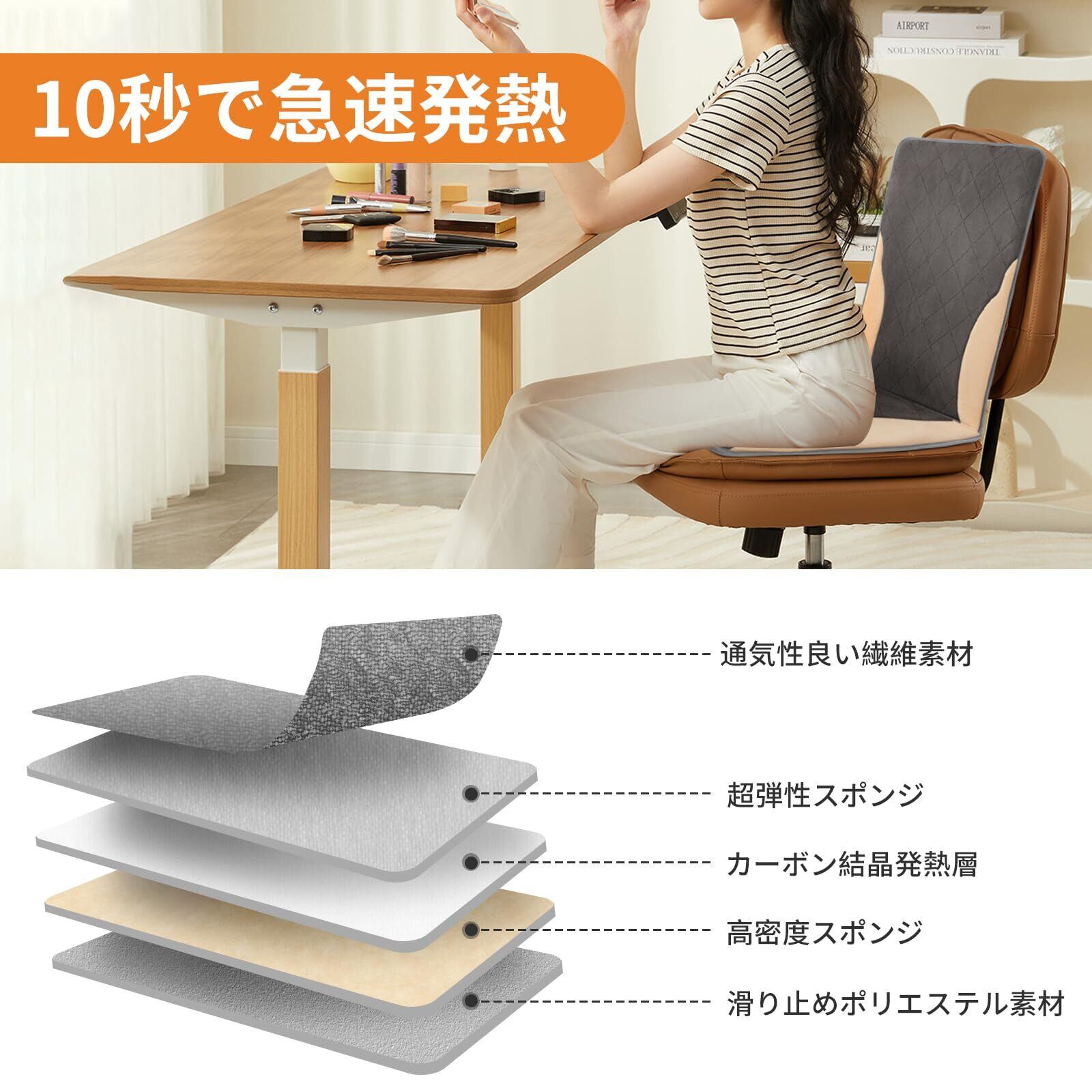 【優れた通気性&滑り止めデザイン】電気ホットマットは通気性の高い繊維素材を採用しており、肌に優しい、柔らかくて快適な触感を実現しています。超弾性、変形しにくいです。電気ホットマットは底部にシリコン製の滑り止め粒子が付いており、滑りにくいです。さらに、調節可能な固定ベルトが付いており、二重の防滑機能を備えています。座布団がしっかりと固定され、安定に使用することができます。