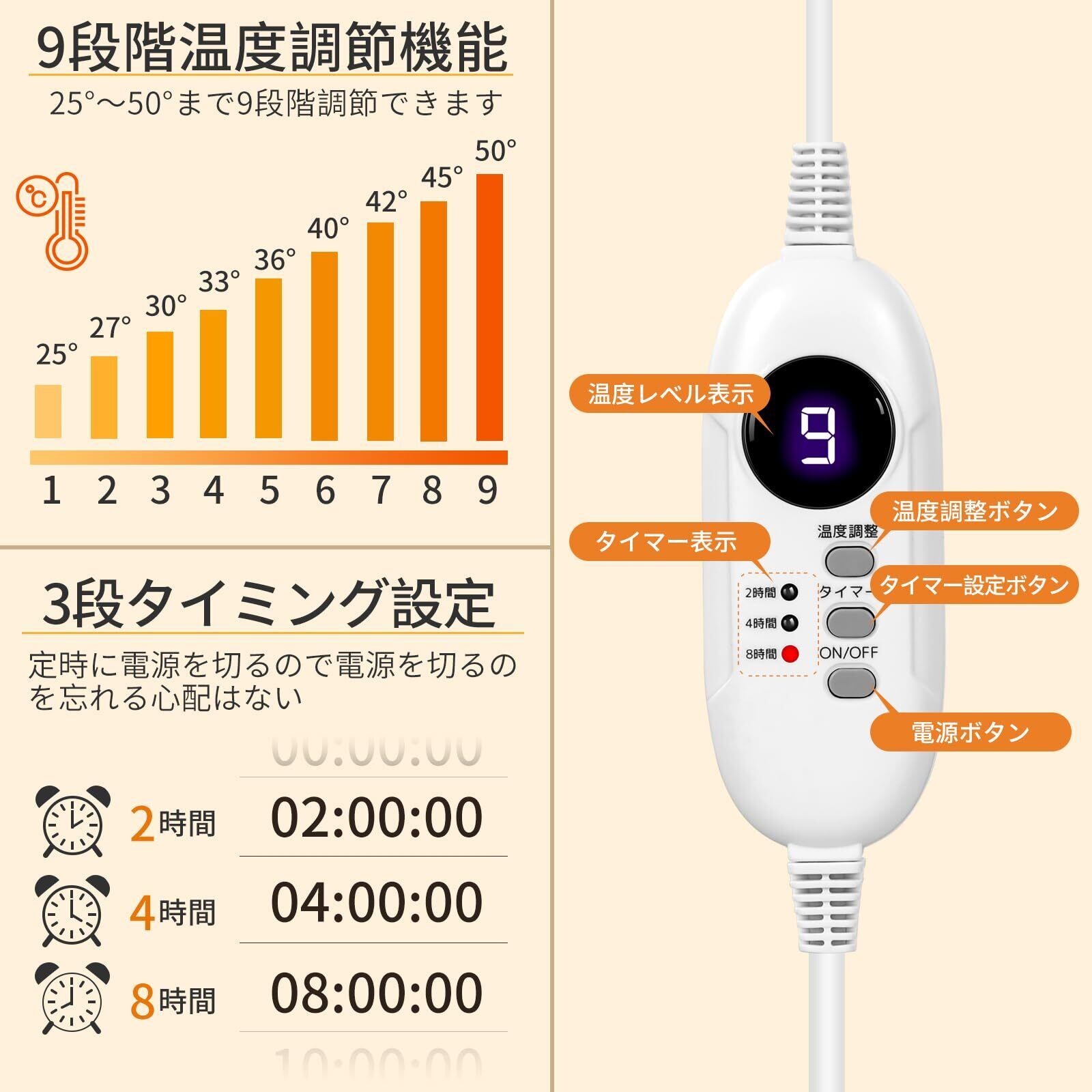 【10秒速熱&9段階温度調節】の電気マットは先進的なカーボンファイバー加熱技術を採用して、効率的で均一な発熱を実現し、発熱して暖かくなるのに10秒しかかかりません。寒い季節にも快適に過ごせます。 温度は25°C から50°Cまでの9段階で、個人の好みや季節に合わせて適切な温度を選択できます。自分に最適な温度でリラックスできるでしょう。
