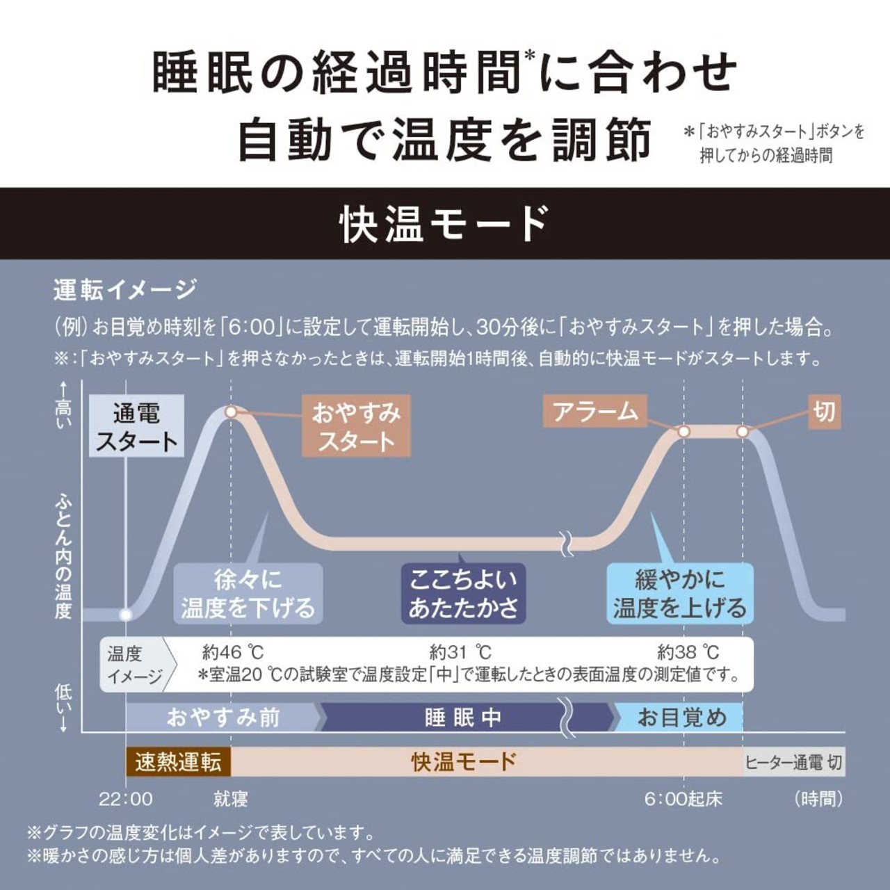 ●おやすみから起床まで、自動で温度をコントロールする快温モード搭載。