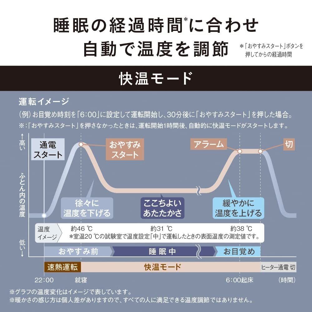 ■【温度自動調整機能で安心】室温を感知して、温度を自動で調節する機能を備えています。これにより、常に快適な温かさを保ちつつ、省エネ効果も期待できます。温度の変化に応じて自動で調整されるため、安心してお休みいただけます。