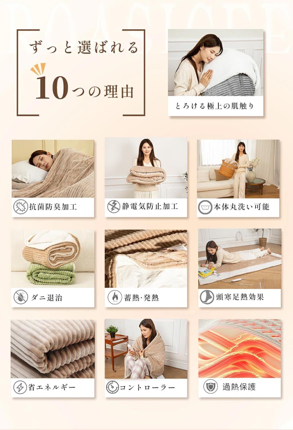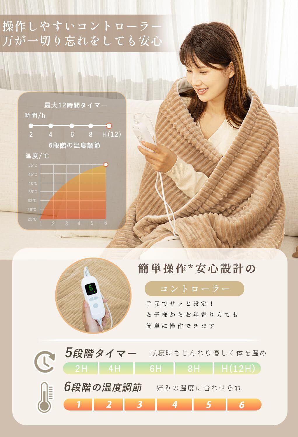 ■【6段階の温度調整とタイマー機能】お好みに応じて温度を6段階に調整可能。タイマーは2時間から12時間までの設定ができ、うっかり切り忘れる心配もありません。安心してご使用いただける環境を提供し、快適な眠りをお手伝いします。