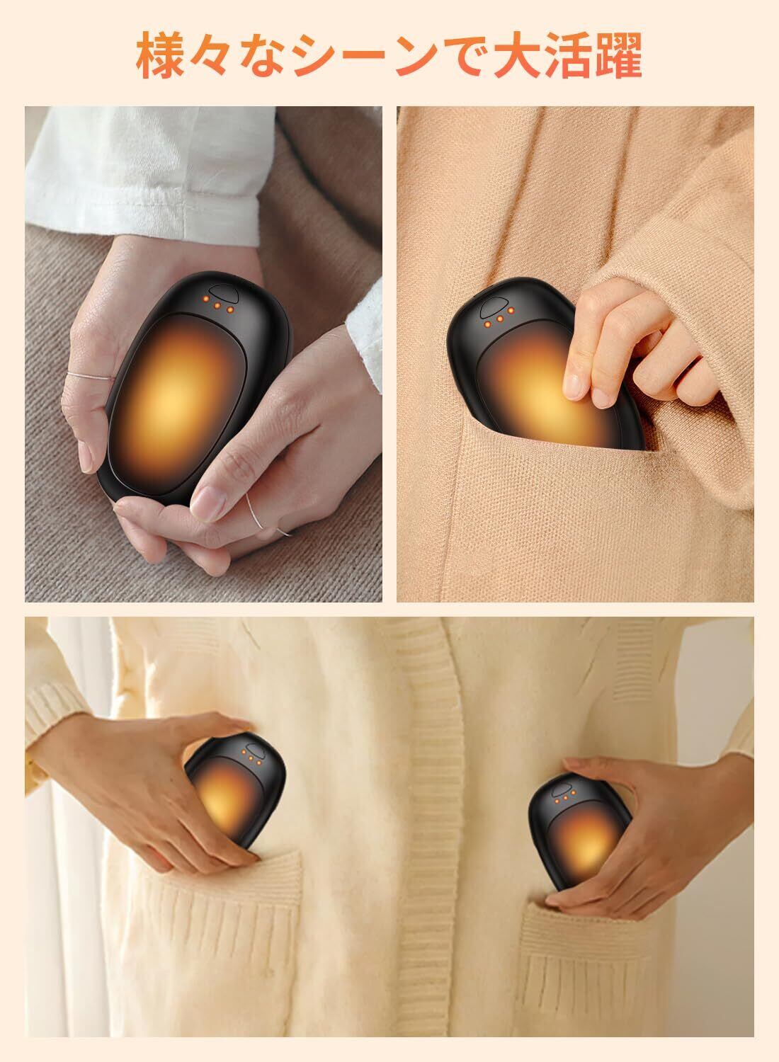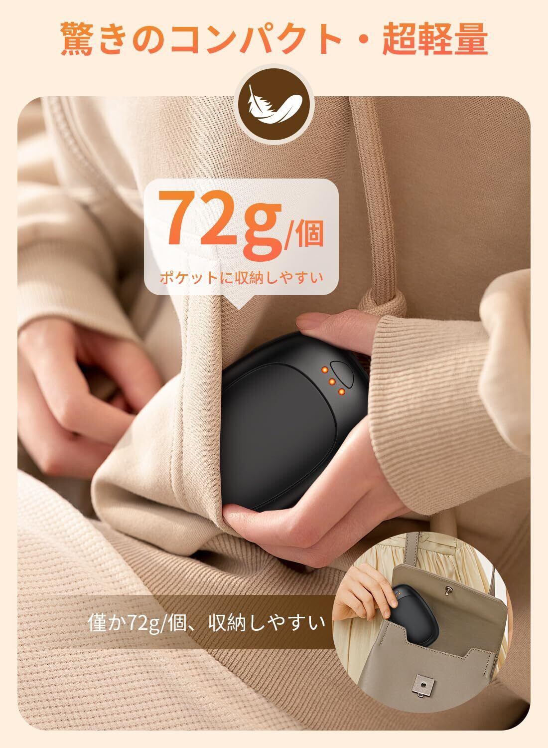 「超軽量コンパクト・携帯便利」1個の重量はわずか72gで、女性やお子様もストレスなく握りやすく、二個並べる場合の本体サイズは幅94*57*37mmで、収納・持ち運びやすいです。スマホより小さいカイロはポケットを入る可能なので、持ち歩いできます。家、会社、通勤、通学、キャンプなどの場所はピッタリです。これから、冬場で暖かい電気式カイロを持って、快適な生活を目指します。