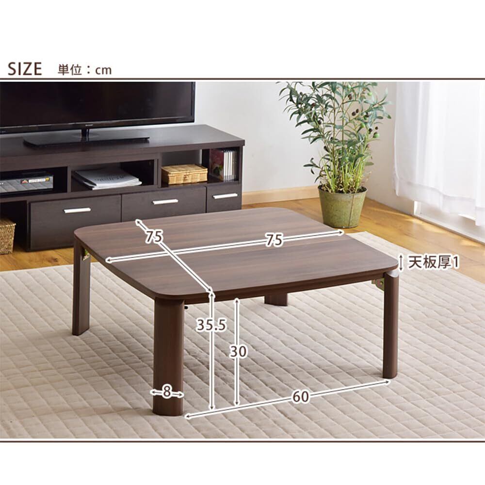 タンスのゲン 折れ脚 こたつ テーブル 正方形 75×75cm フラットヒーター 手元コントローラー 木目 天板リバーシブル ウォールナット 21300016【84580】