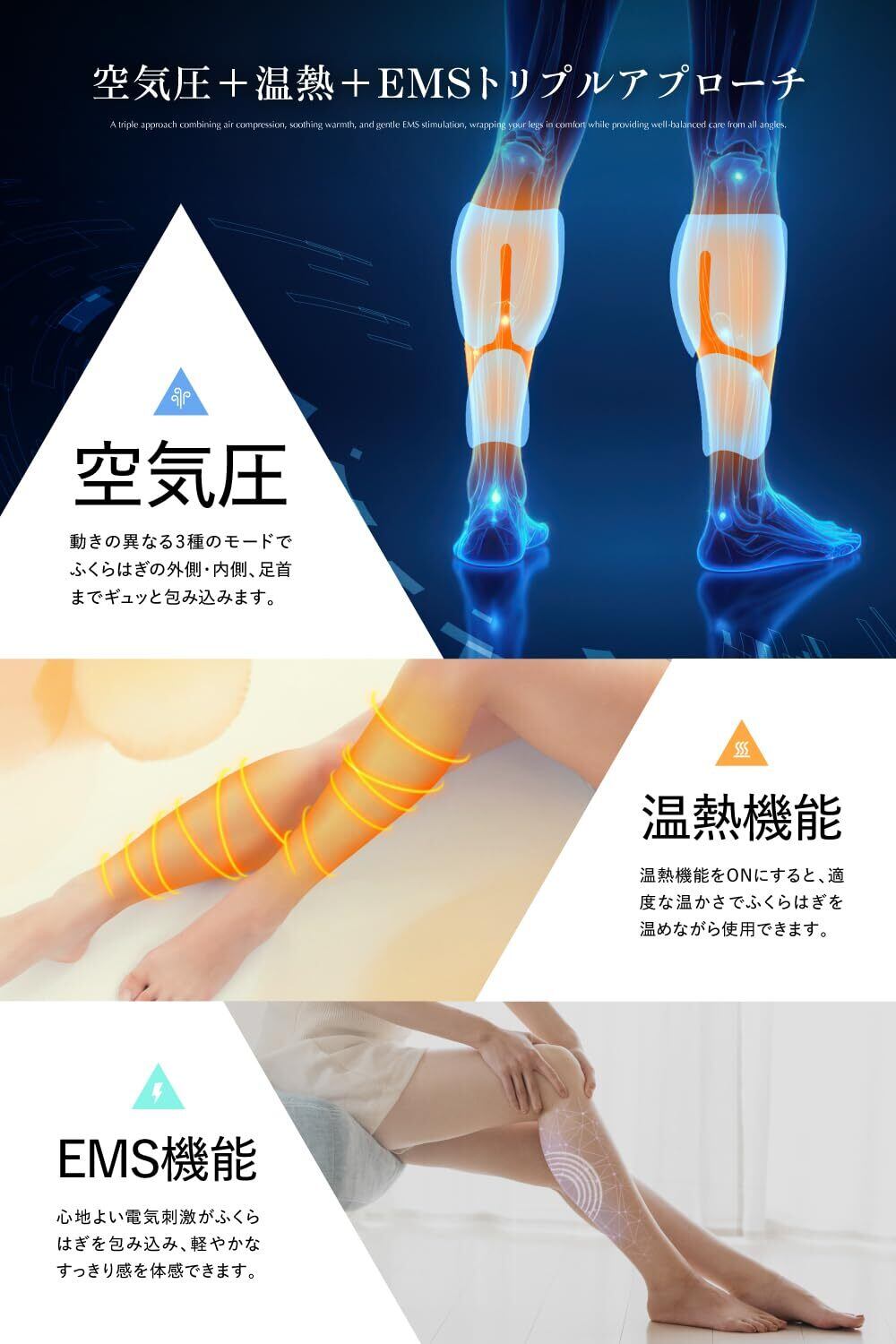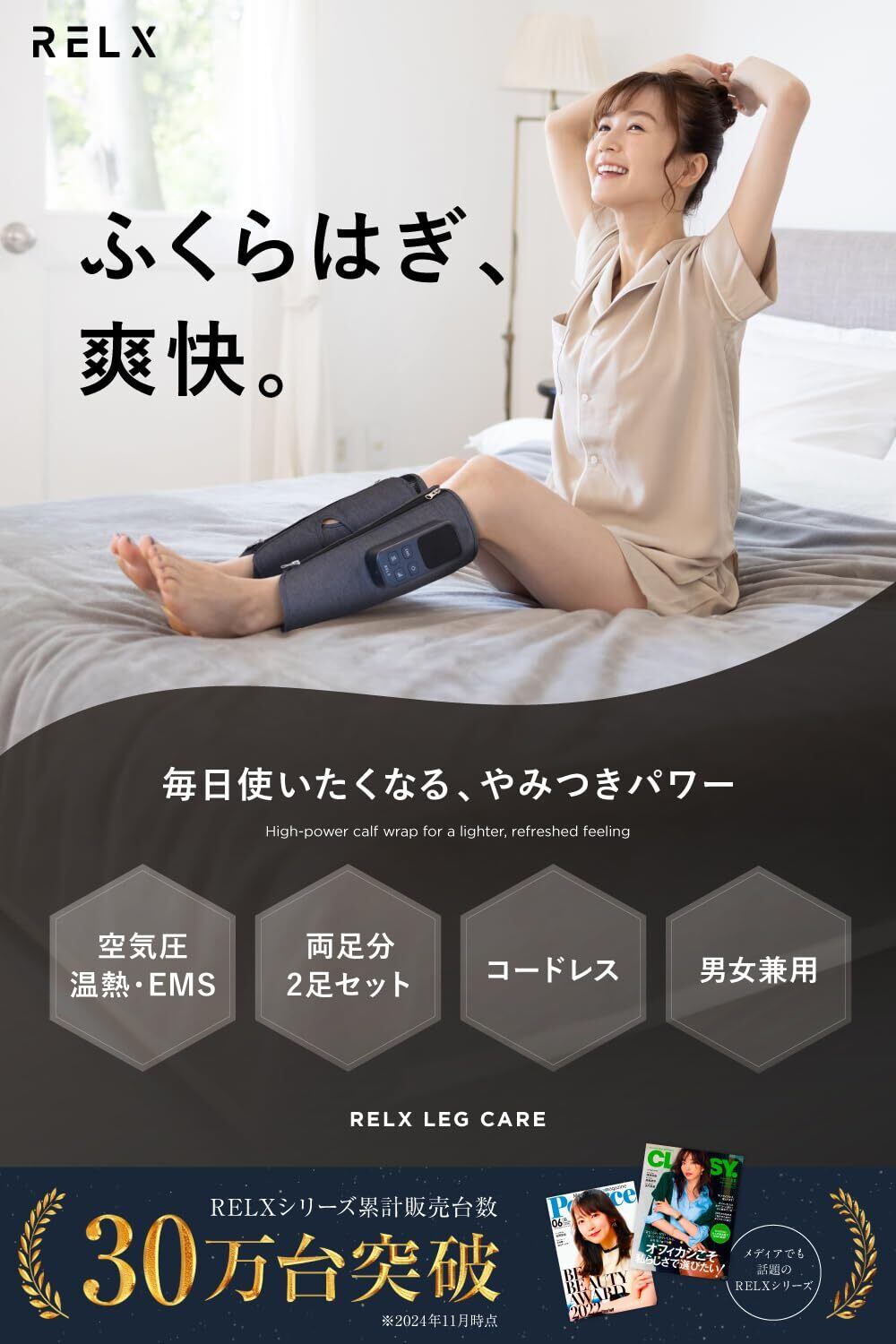 ■【脚の疲れを効果的にケア】RELXのレッグケアは、ふくらはぎをしっかりと包み込む空気圧と温熱機能を搭載し、日々の疲れを優しく癒します。特に立ち仕事や運動の後に、心地よいリフレッシュ感を提供するアイテムです。