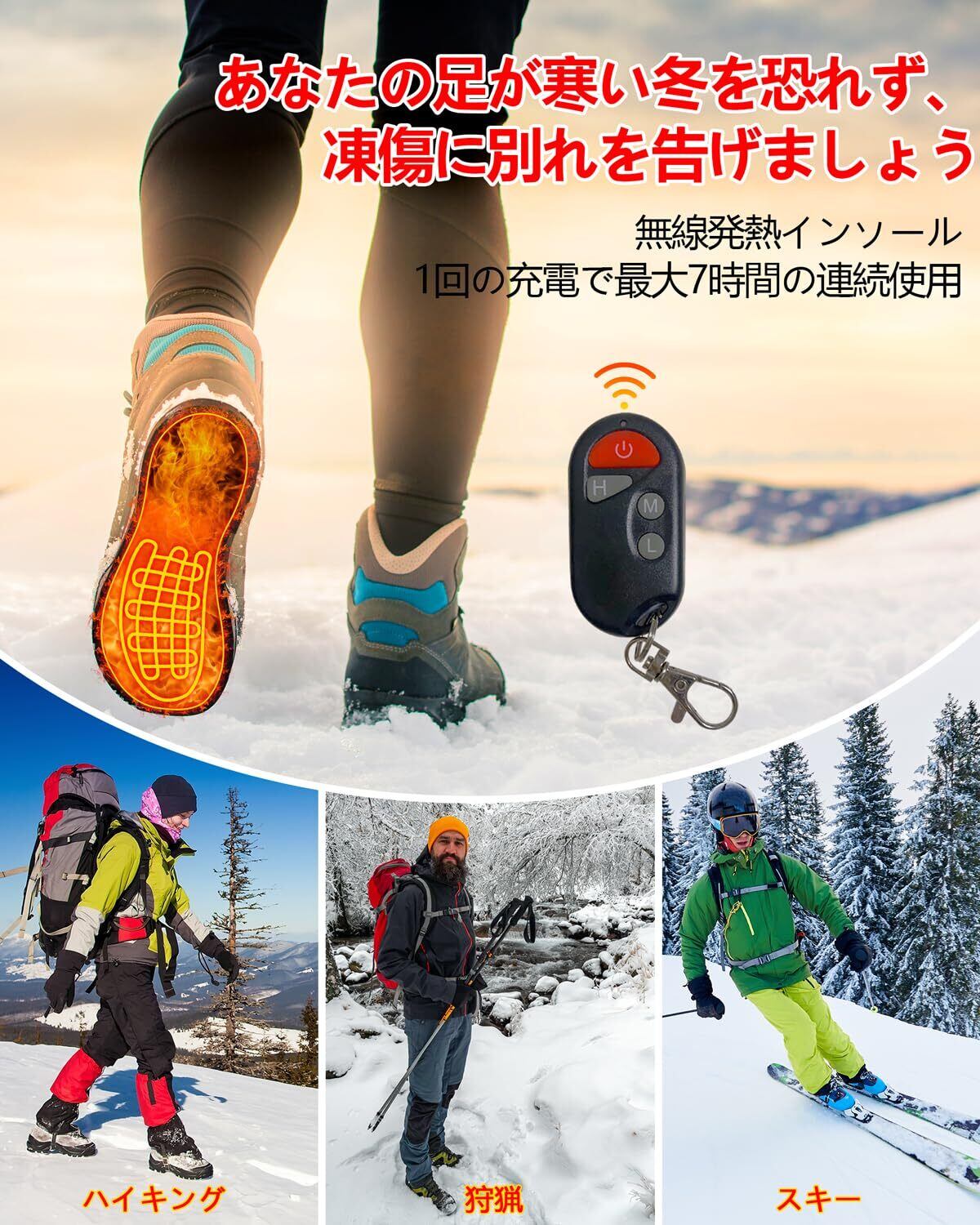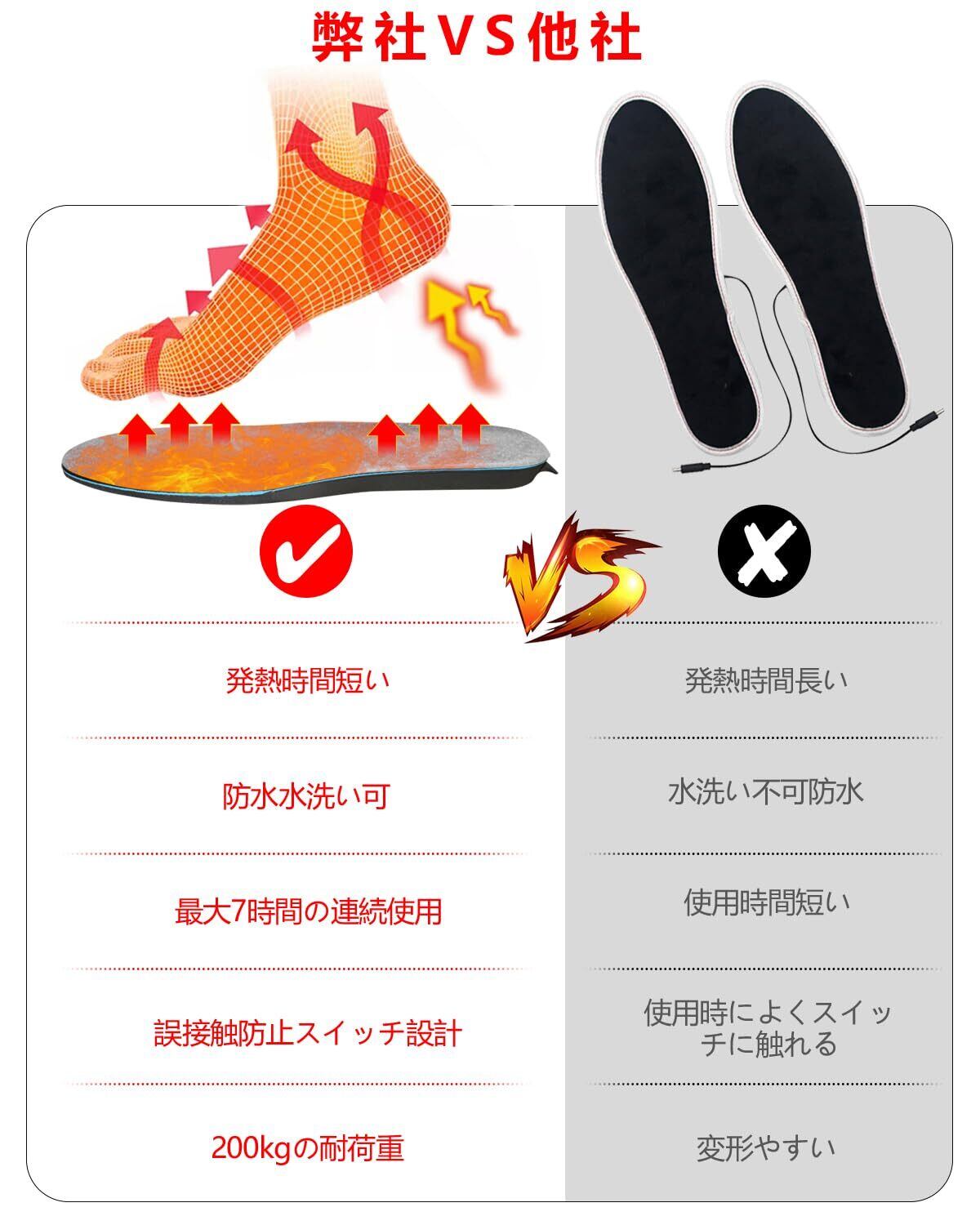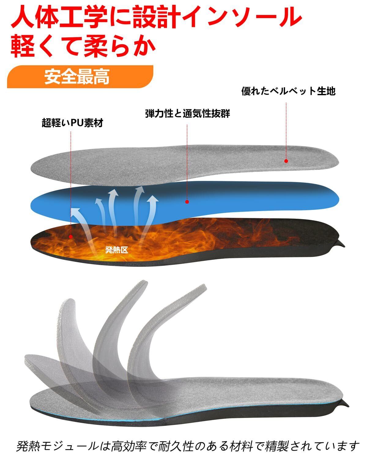 【防寒対策に効果的】電熱線内蔵で軽くてあったかインソールです。ソール全面に張り巡らされた電熱線により、かかとからつま先まで効果的に保温でき、底冷えから足を守ります、血行を促進する。冷え性の方や防寒対策に効果的です。寒冬-20℃でも快速的に発熱できます。