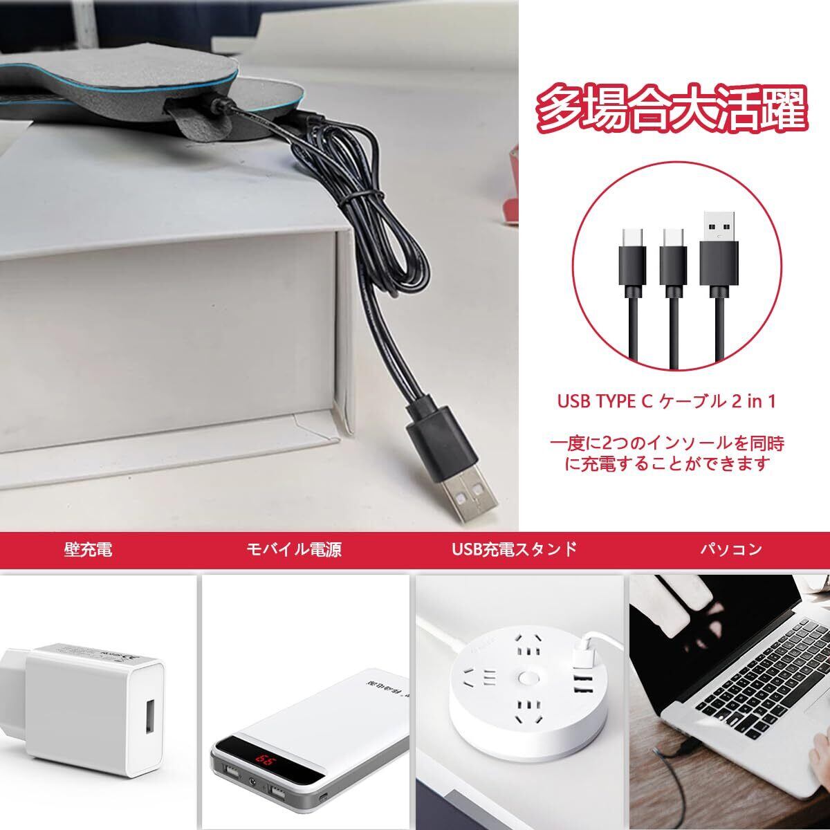 【USB給電で持ち運び便利】USB給電のあったか電熱インソールになります。急速充電器でも安全にお使いいただけます。USB充電器での使用も可能ですので、ツーリングやドライブだけでなく、釣り、保護、スキー、ウォーキングなど、冬の野外活動に適しています。